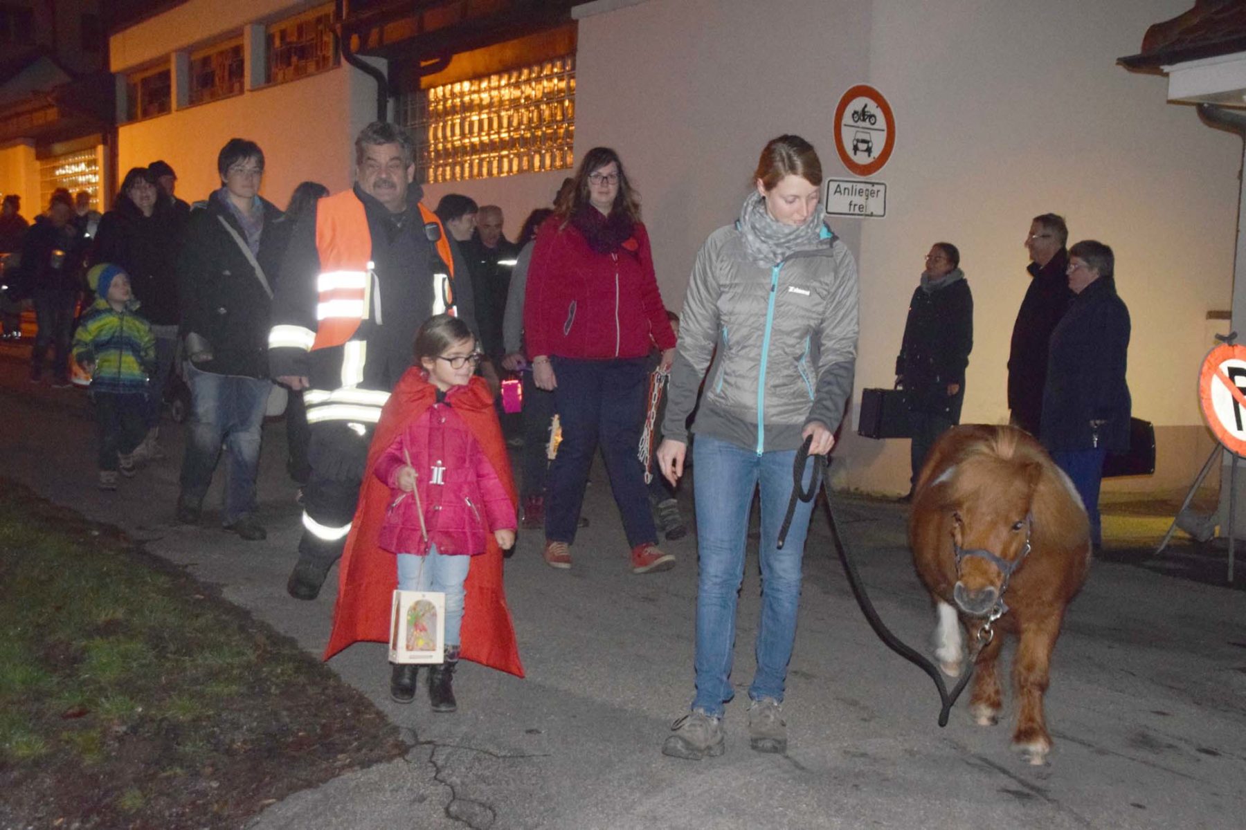 Danach gingen die Kinder mit ihren leuchtenden Laternen, begleitet von ihren Angehörigen, in einem langen Zug zum Schulhaus. Angeführt wurden sie von Carmen Muser, die ihr Pferd Bonsai am Zügel führte, und dem heiligen Martin im roten Mantel, dargestellt von Annabell Apfel. Dann ging der Umzug zunächst in den Kurpark, um am Ende auf dem Festplatz halt zu machen. Dort brannte das lodernde Martinsfeuer. Am Ende der Feier übergaben Bürgermeister Carsten Erhardt, Gemeindereferentin Anke Haas und Prädikant Joachim Groß den Kindern eine Martinsgans aus Hefeteig, gespendet von der Gemeinde Nordrach. Für das leibliche Wohl der Besucher sorgten in diesem Jahr die Eltern der Schulanfänger des Kindergartens.