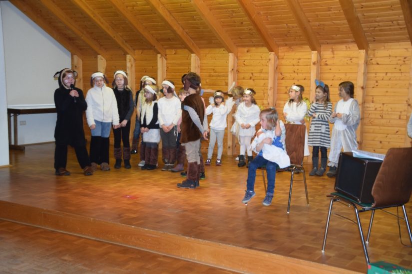 Danach führten Grundschüler das Weihnachtsmusical „Lenny das Schaf“ auf. Der Inhalt: Lenny will mit seinen Freunden auf Schatzsuche gehen. Aber die gestressten Hirtenhunde lassen sie einfach nicht aus den Augen. Als dann plötzlich Engel auftauchen, laufen die Schafe vor Schreck quer über das ganze Feld und die Hirtenhunde haben alle Hände voll zu tun, sie wieder einzufangen. Lenny nutzt die Gelegenheit und macht sich selbst auf die Suche nach dem verheißenen Kind.