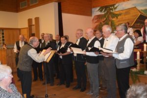 Der Wandererchor sang im ersten Teil Berg- und Heimatlieder, um dann im zweiten Teil ebenfalls mit adventlichen Weisen die Besucher auf den Advent einzustimmen. Die dreizehn Sänger haben unter der Leitung von Thomas Trappe ein hohes musikalisches Niveau erreicht. Als ein Quartett von ihnen die Lieder »Der Engel des Herrn brachte Maria die Botschaft« und »Gegrüßt seist Du Maria« sang, wurde es im Raum mucksmäuschenstill und die Sänger wurden danach mit Beifall geradezu überschüttet. Am Ende des Konzertabends sangen Musiker und Publikum gemeinsam den Canon »Abendstille überall«. Ein weiterer Höhepunkt war der »Andachtsjodler«, der als Zugabe erklang und den Konzertabend stimmungsvoll abschloss. Das sichtlich ergriffene Publikum sparte nicht mit Applaus.