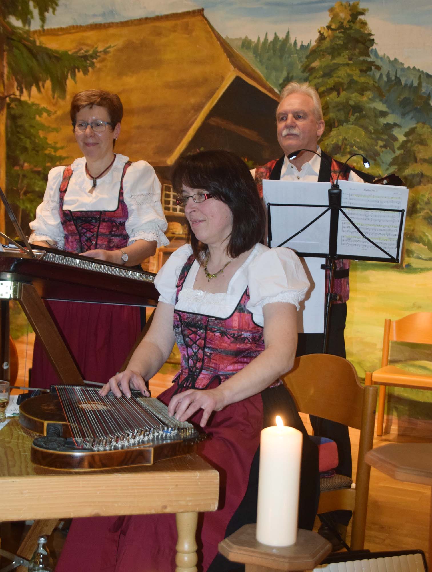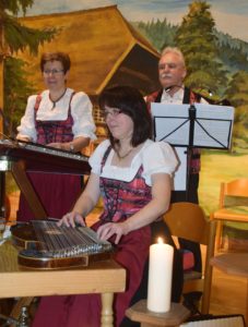 Luitgard Bieser von der Nordracher Stubenmusik freute sich über das volle Haus und begrüßte die Gäste mit dem Gedicht »Ich wünsche Dir Zeit« von Elli Michler. Dann ließen Luitgard Bieser (Hackbrett), Antonia Haas (Zither, Kontrabass, Steirisches Akkordeon), Susanne Hansmann (Zither) und Georg Wimmer (Gitarre, Trompete) ihre Instrumente erklingen und zogen sofort das Publikum in ihren Bann. Die Stubenmusik spielte gekonnt und abwechslungsreich adventliche Weisen und alpenländische Lieder. Luitgard Bieser, Antonia Haas und Susanne Hansmann begeisterten auch mit schönen Gesangseinlagen. Sehr berührend sangen sie das alt-bayrische Lied «Staad staad heit is Advent«, mit brennenden Kerzen in den Händen.