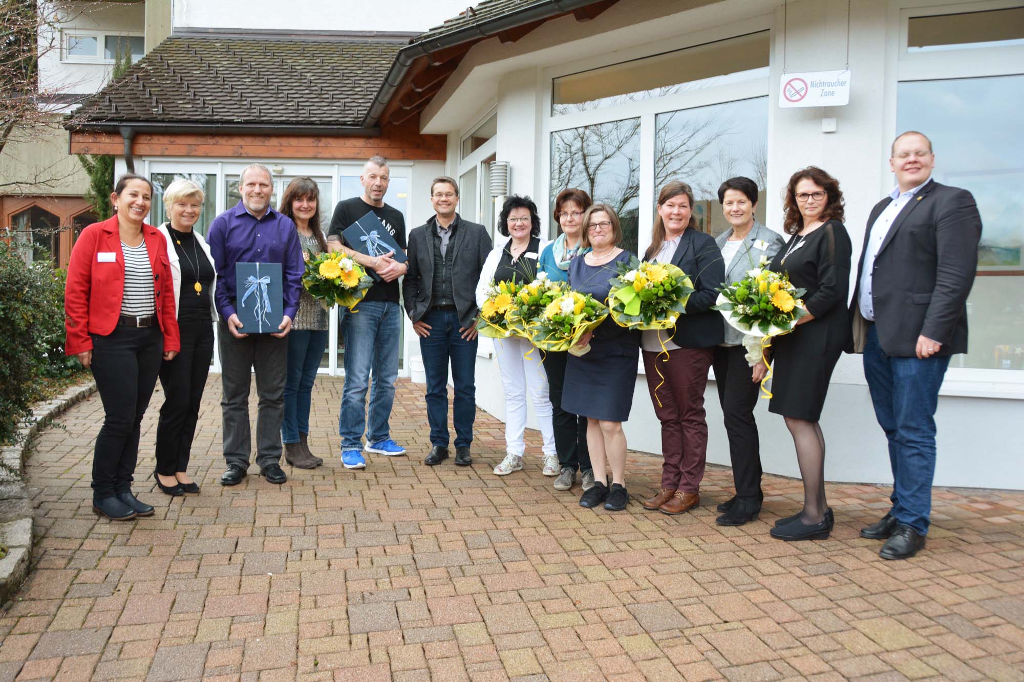 Jubilarsfeier bei der Winkelwaldklinik (von links): Dr. med. Samina Shah, Geschäftsführerin Bettina Lehmann-Isenmann, Tobias Haas, Britta Lehmann, Georg Beck, ärztlicher Direktor Dr. med. Timm Dauelsberg, Christine Rauer, Ilona Halter, Dora Volk, Tanja Fritz, Geschäftsleitungs-Assistentin Christa Heilig-Seidl, Christine Mack und Bürgermeister Carsten Erhardt. Foto: Hanspeter Schwendemann