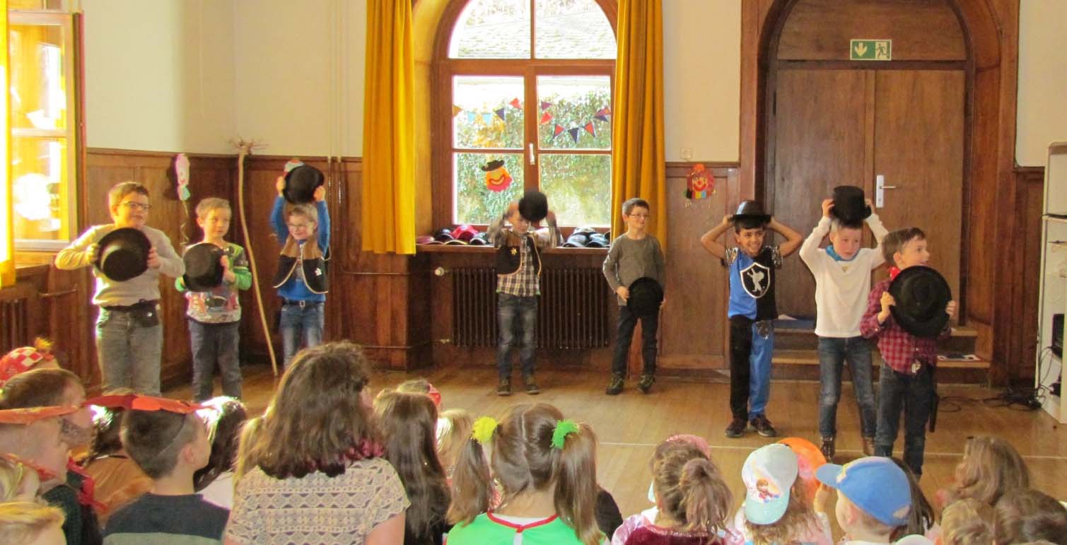 Anschließend zogen alle zur Grundschule, wo die Kinder aus den Klassenzimmern befreit wurden. In der Turnhalle präsentierten die einzelnen Klassen Tänze und Spiele und sangen auch das Glashansele-Lied. Das Lehrerkollegium hatte sich gemäß dem Fasendmotto mit alten Berufskleidern präsentiert. Die Narrenräte mussten die alten Berufe pantomimisch darstellen und erraten, was ihnen vortrefflich gelang.