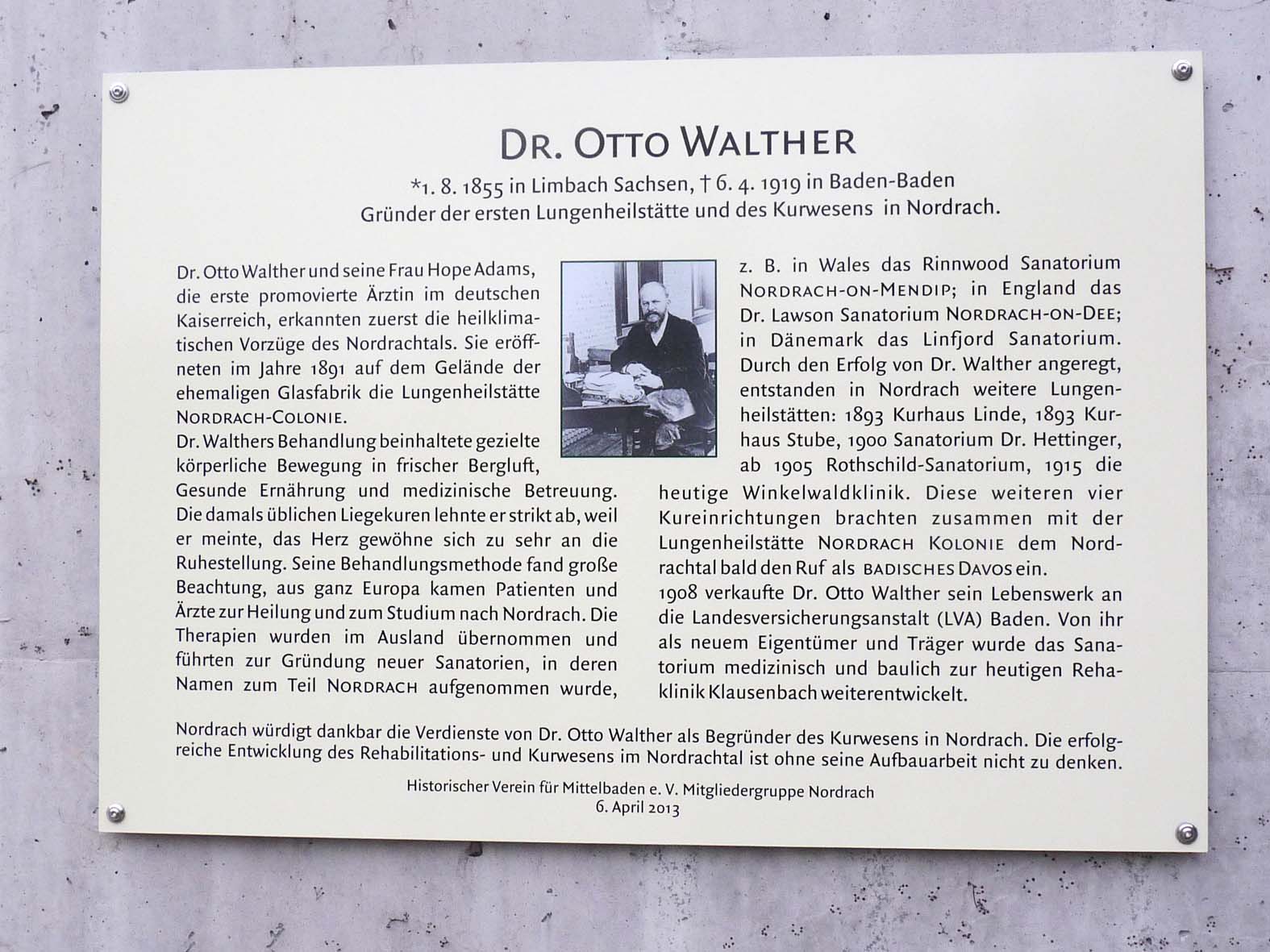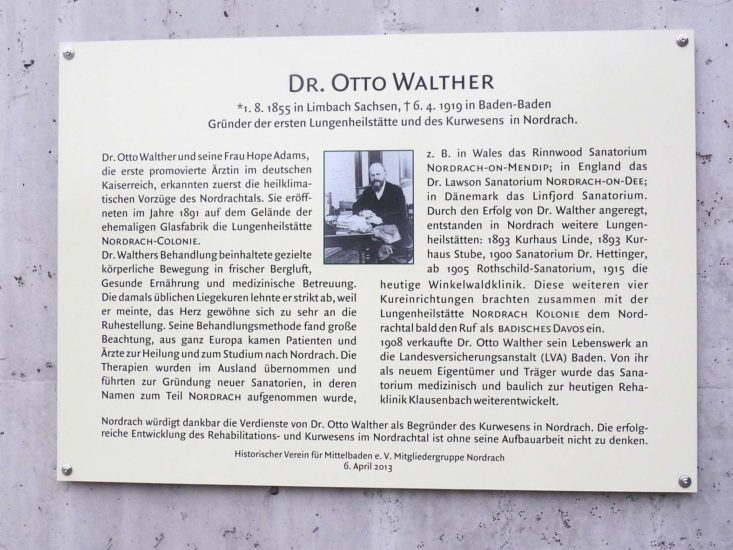 Dr. Otto Walther und seine Ehefrau Hope Adams eröffneten im Jahr 1891 auf dem Gelände der ehemaligen Glasfabrik die »Lungenheilstätte Nordrach-Colonie«. Dies war die Initialzündung für die Gründung von drei weiteren Lungenheilstätten in den folgenden fünfzehn Jahren in Nordrach. Das kleine Schwarzwaldtal genoss bald einen ausgezeichneten Ruf als Lungenluftkurort und man nannte es das »Badische Davos«.