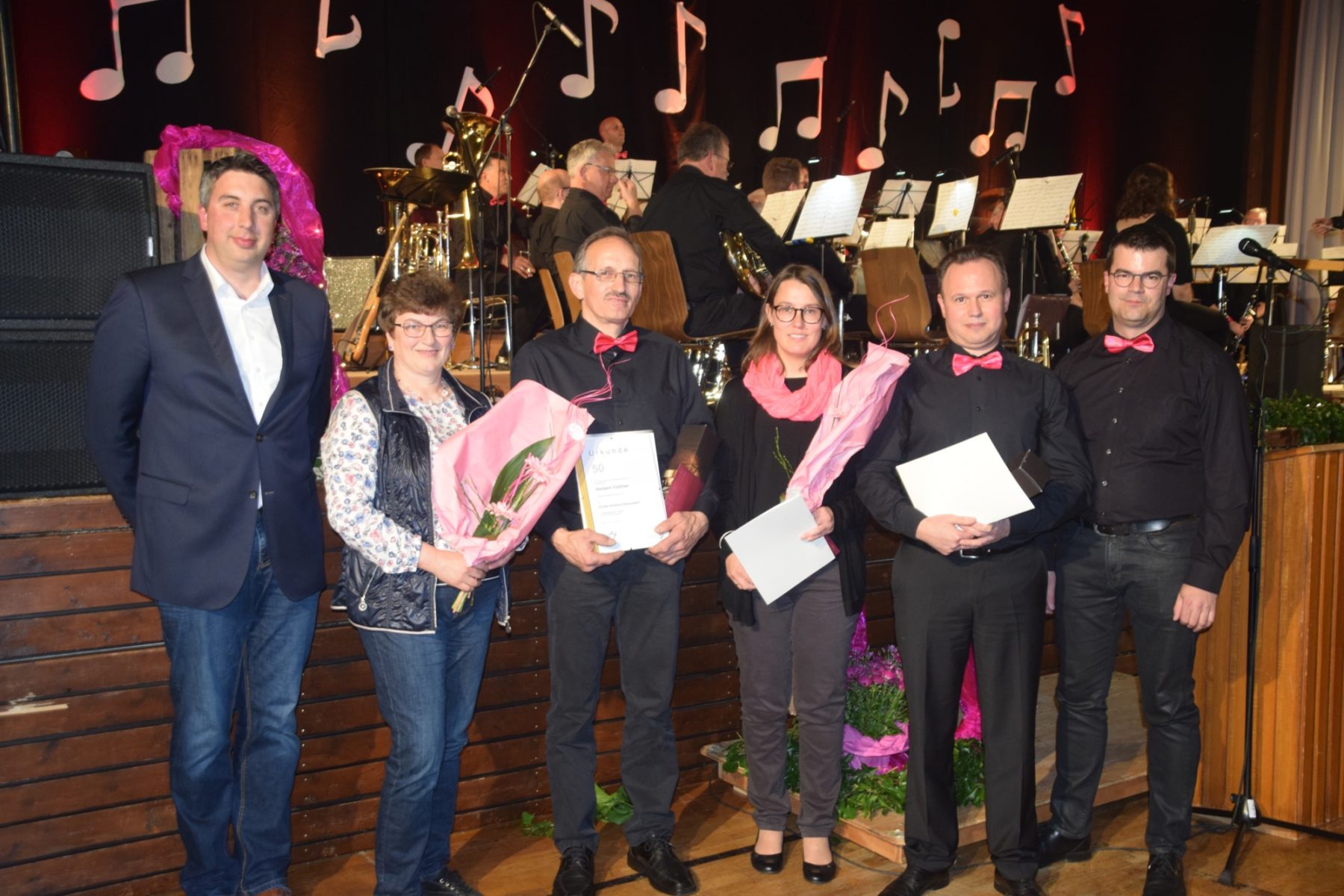 Eine außergewöhnliche Ehrung konnte Franz Boschert erhalten. Er ist seit 65 Jahren aktives Mitglied und spielt seither das Flügelhorn. 25 Jahre war er Mitglied des Verwaltungsrats, in einer Zeit, in der einschneidende Veränderungen stattfanden. Zu seinen Ehren spielte die Kapelle seine Lieblingspolka »Nimm zwei weiße Rosen«.