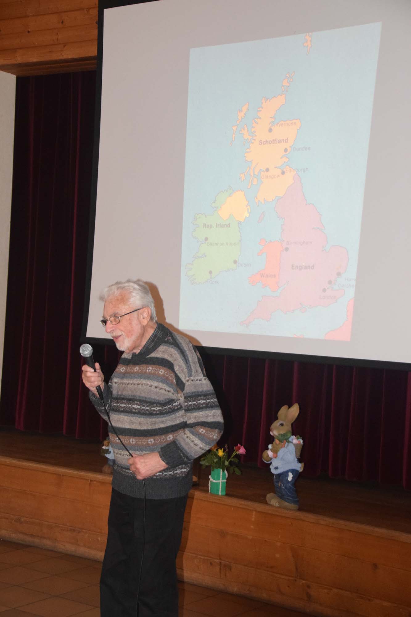 Foto: Herbert VollmerOthmar Wolf, gebürtiger Nordracher mit Wohnsitz in Freiburg, kommt seit vielen Jahren mit interessanten Reiseberichten nach Nordrach. Das Reiseziel war diesmal Schottland und die Schotten. Die Reise begann im südlichen Hochland, das aus sanften Hügeln und breiten Flusstälern besteht. Nördlich davon liegt das zentrale Tiefland, in dem sich die meisten Städte befinden und ein Großteil der 6,5 Mio. Einwohner wohnt. Wolf beschrieb die Industriestadt Glasgow und die Hauptstadt Edinburgh. Weiter nördlich schließt sich der größte Teil Schottlands an, das nördliche Hochland. Es ist stark zerklüftet, tausende Seen prägen die Landschaft, mächtige Berge ziehen die Blicke auf sich. Fischfang, Nordseeöl und Scotch Whisky sind wichtige wirtschaftliche Säulen. Das Ungeheuer »Nessy« in Loch Ness ist eine Touristenattraktion, »auch wenn sich das Ungeheuer immer seltener zeigt«, wie Wolf schmunzelnd meinte.
