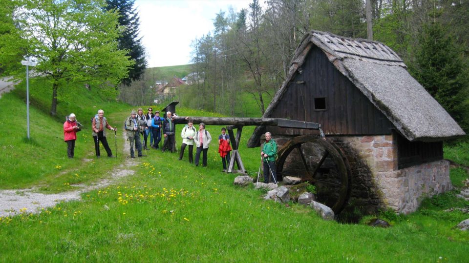 Nach der Umrundung dieses Hochtales war der idyllische Reiz der Tour noch nicht zu Ende. Talauswärts ging es einige Kilometer auf einem Bachwegle am ursprünglich erhaltenen romantischen Sulzbach entlang. Da stand ein altes strohgedecktes Häuschen am Bach, eine Mühle mit Wasserrad – die Mühle des Winterbauernhofes. Noch echt Schwarzwald. Weiter dem Wildbach entlang führte der Weg hinab zum Ausgangspunkt der Tour. Mit seltenen Eindrücken ging dank der Tourenführer Anneliese und Franz Huber ein glücklicher Wandertag zu Ende.