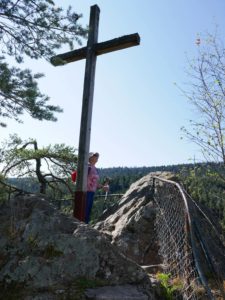 Vom Start weg ging es gleich steil nach oben zum Kreuzfelsen und damit auf den »Lauterbacher Wandersteig«. Der kreuzgeschmückte Gipfel bot einen faszinierenden Tiefblick auf den Ort Lauterbach und dessen Schwarzwaldtäler. Nochmal ein Stück bergwärts kam man wenig später zu einem Aussichtspavillon, der uns mit einer ganz anderen Blickrichtung, nun ins Sulzbachtal, überraschte. Auf der Höhe angekommen, ging es leicht bergauf und bergab zu der Siedlung Imbrand und Hölzlehof. Meist am Waldrand entlang kam man nun auf den sogenannten Waldmännleweg. Dort erfährt man immer wieder an Stationen interessante Details über Wald, Flur und Botanik.
