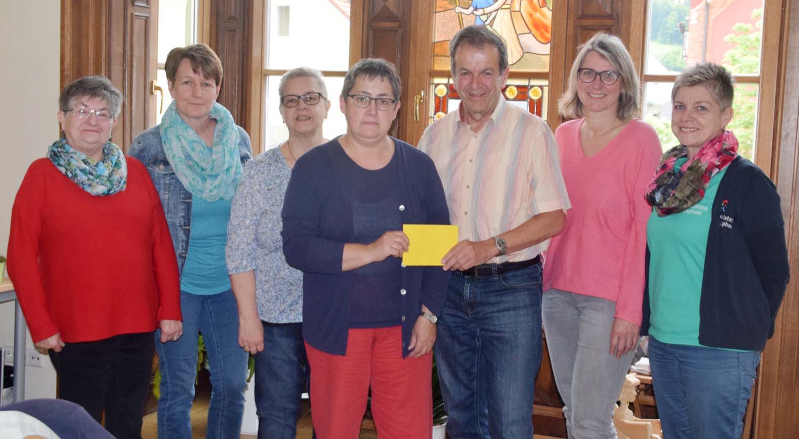 Der Vorsitzende der Sozialstation Herbert Vollmer empfing mit dem gesamten Leitungsteam Barbara Armbruster, Marijke Heitzmann und Birgit Stein die Abordnung der Nordracher Frauengemeinschaft, um ihre Spende entgegenzunehmen.