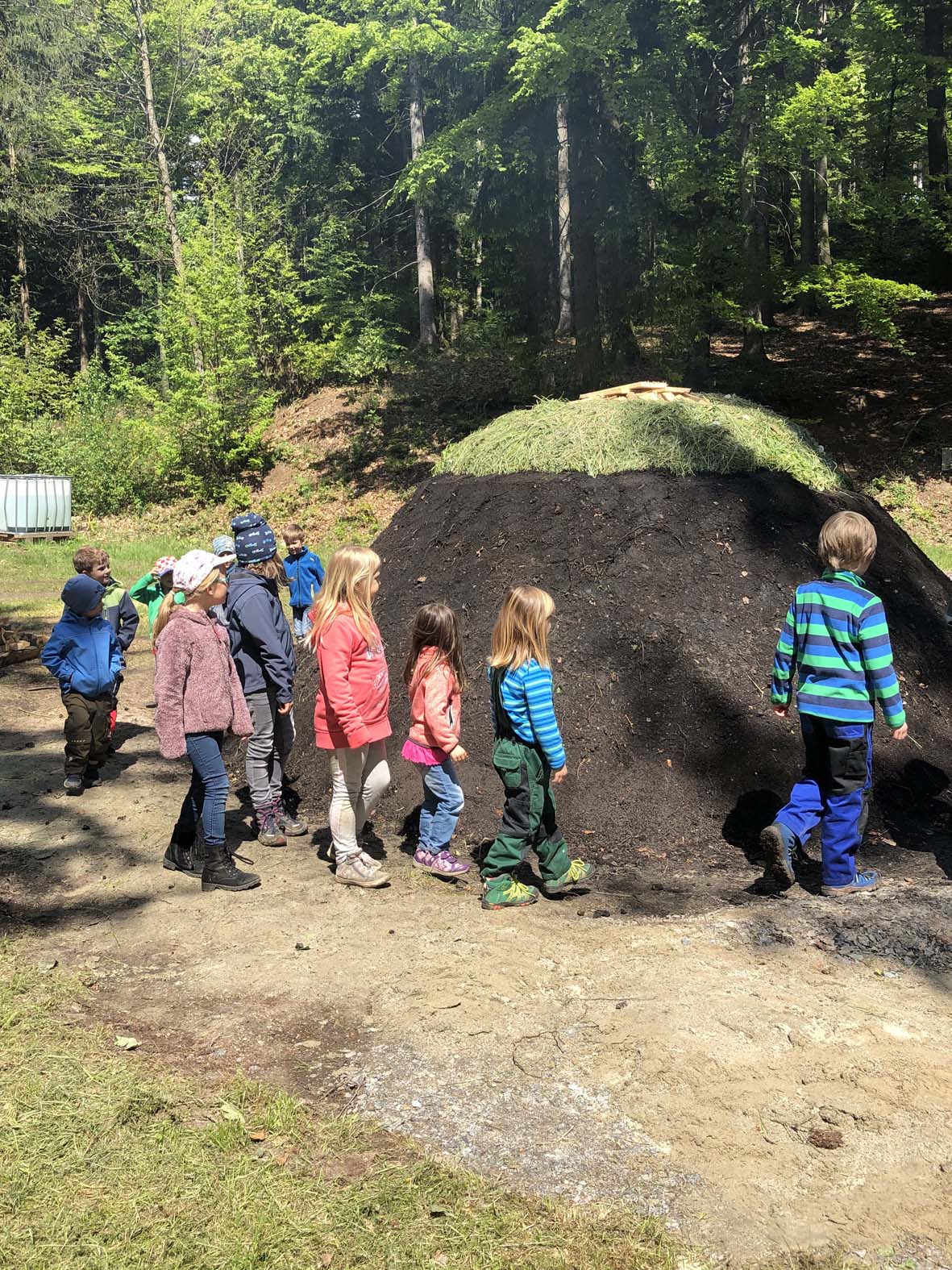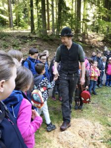 Einen Köhler bei der Arbeit sieht man nicht alle Tage und so waren es lebendige Gespräche am Meiler mit Thomas Faißt, der gerne alle Fragen der Kinder beantwortete und versucht hat, dieses alte Waldgewerbe den Kindern näher zu bringen.