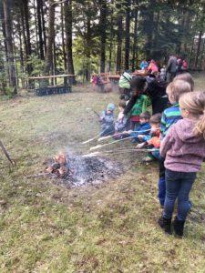 Der Besuch der Kindergarten-Kinder wurde vom Elternbeirat organisiert und durchgeführt. Sonja Waschka kam mit 22 Kindern und Eltern an den Kohlenmeiler. Bei Kuchen und Getränken gab es viele Informationen durch den Köhler. Die Kinder konnten ein wenig mithelfen und entfachten ein Feuer zum Stockbrot-Backen. Mit Köhler Thomas Faißt wurden Stöcke geschnitzt und die Glut am Brennen gehalten.