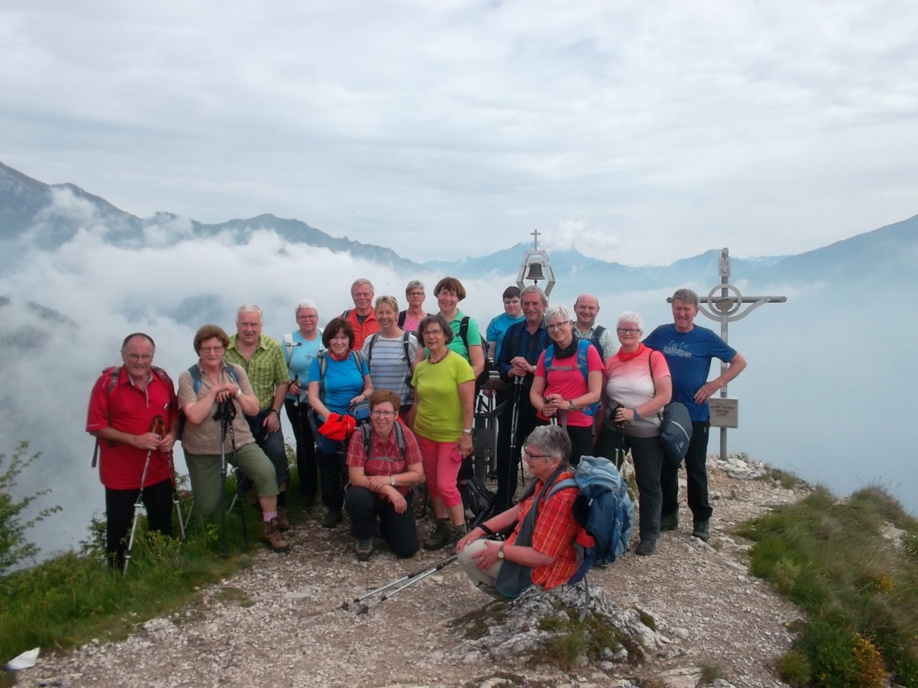 Auch der Mittwoch versprach ein schöner Tag zu werden. Alle zusammen fuhren mit der Fähre von Torbole nach Limone. Zwei Taxis brachte die Gruppe zum Hotel La Balze in Voltino. Von hier marschierte sie die rund 200 Höhemeter zum Monte Bestone. Leider lag der Gardasee noch im Nebel. Auch von den umliegenden Berggipfeln sah man hin und wieder eine weiße Bergspitze, bevor diese wieder im Nebel verschwanden. Doch die Sonne kämpfte sich durch und als die Wanderer nach einer Stunde das Gipfelkreuz des 916 Meter hohen Monte Bestone erreichten, hatten sie einen grandiosen Panoramablick auf den Monte-Baldo-Bergrücken, den Gardasee und das 850 Meter tieferliegende Örtchen Limone. Nun ging es an den Abstieg. Die ersten 100 Höhenmeter waren als schwierig und nur für geübte Bergsteiger angekündigt – dieser Abschnitt wurde, ebenfalls wie die restlichen 800 Meter von allen Teilnehmern konzentriert und mit Bravour bewältigt. Nach einem anstrengenden 2,5-stündigen Abstieg über Schotterwege durch Kiefern- und Olivenhaine erreichten sie müde aber glücklich und zufrieden Limone. Nachdem der Flüssigkeitshaushalt wieder ausgeglichen und ein Bummel durch die belebten engen Straßen und Gassen von Limone abgeschlossen war, ging es mit dem Schiff wieder nach Torbole zurück.