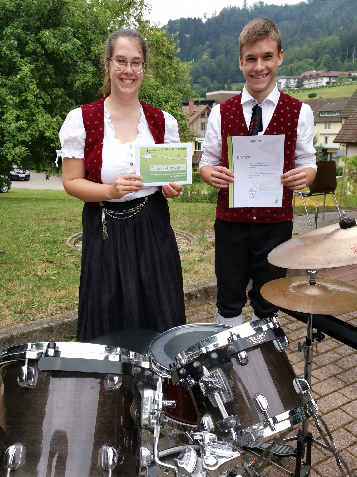 Die Jugendleiterin der Trachtenkapelle Nordrach e.V. Carina Huber konnte im Anschluss an das Frühschoppenkonzert beim Pfarrfest Ruben Fehrenbacher die Urkunde für das erfolgreich absolvierte Jungmusiker-Leistungsabzeichen in Bronze überreichen.