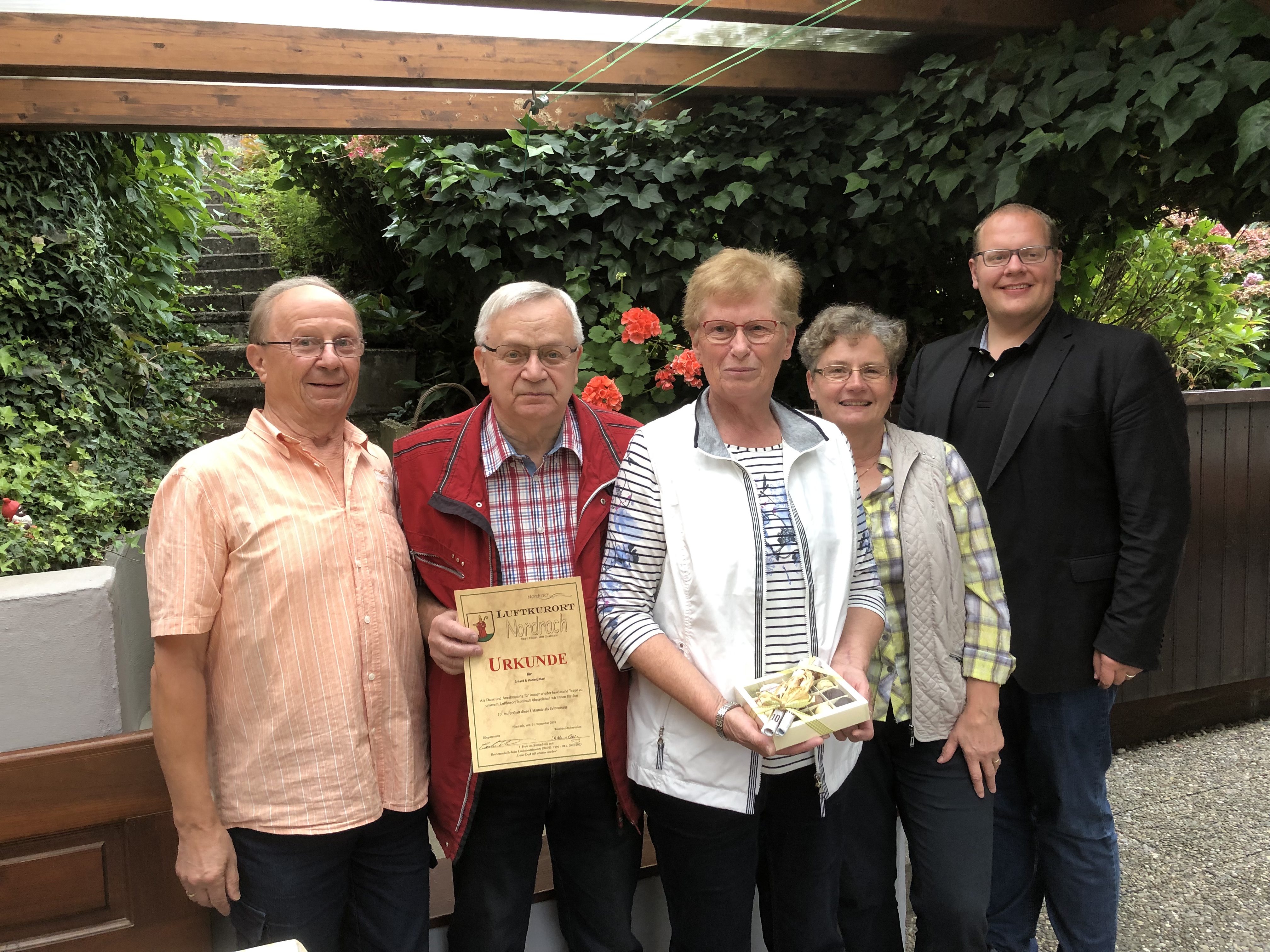 Bürgermeister Carsten Erhardt und Leiterin Barbara Kamm-Essig von der Touristen-Info Nordrach gratulierten dem Ehepaar Bart aus Soest herzlich. Zehnmal Urlaub in Nordrach ist auch für die Gastgeber, Rita und Engelbert Lehmann, ein besonderer Grund zum Feiern.