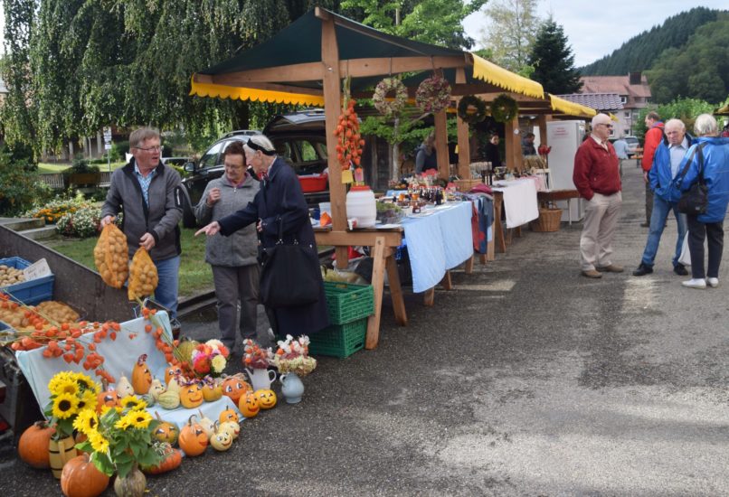 Foto: Herbert VollmerMit regionalen und frischen Produkten direkt vom Erzeuger boten die Landfrauen an neun Ständen alles an, was die Jahreszeit derzeit zu bieten hat: frisch gebackenes Bauernbrot, Kartoffeln, Obst, Tannenhonig, feine Fruchtaufstriche, Kräutersalz, Nordracher Apfelsecco, neuer Wein und Apfelmost, Obstsäfte, Schnäpse und Liköre, aber auch Dekoartikel, Naturseifen, Puppenkleider und eine »Bonbon-Apotheke« mit einem Angebot wie zu Omas Zeiten, alles ohne künstliche Konservierungsstoffe. Corinna’s Hoflädele verkaufte Hombacher Hofkäse, Eier, Wurstwaren und Nudeln, der Biohof Reber frisches, selbst angebautes Bio-Gemüse.