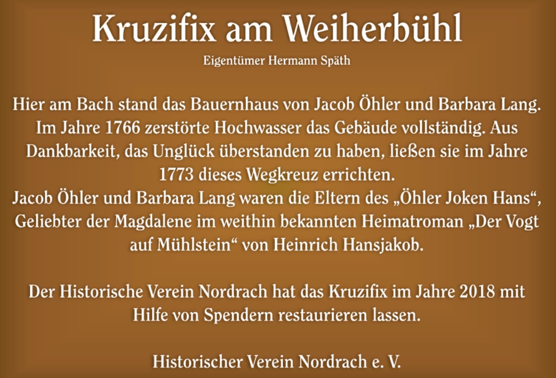 Der stellvertretende Vereinsvorsitzende Thomas Laifer hatte bei seinen Recherchen festgestellt, dass es die Eltern des »Öhler Joken Hans« waren, die dieses Kreuz aus Dankbarkeit aufstellen ließen. Hans war der Geliebte der Magdalene, die von ihrem Vater gezwungen wurde, den Hermesbur zu heiraten. Heinrich Hansjakob hat ihr in seinem Heimatroman »Der Vogt auf Mühlstein« ein literarisches Denkmal gesetzt.