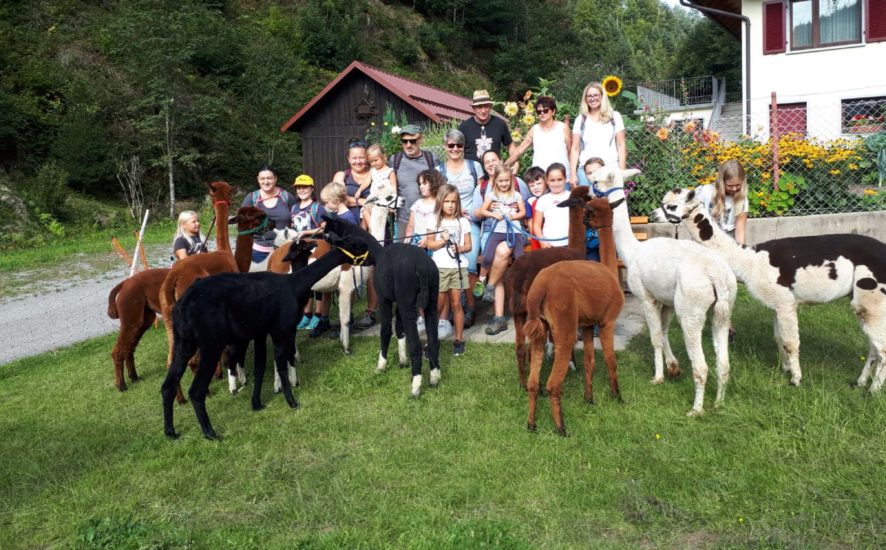 Das Interesse an dem Spielplatz war nicht von langer Dauer, da die Kinder doch lieber mit den Alpakas zusammen sein wollten und auch einige Fragen zu den Tieren erklärt bekommen haben wollten. Bei dieser Wanderung waren ein vier Monate und ein erst drei Wochen altes Alpaka mit dabei, welche sich auch im Kreise der vielen Kinder sichtlich wohl fühlten.