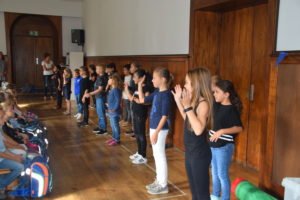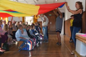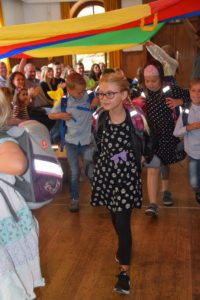 Rektorin Petra Großmann gab bekannt, dass die erste und zweite Klasse zusammengelegt werden. An die Eltern appellierte sie, ihre Kinder los zu lassen, sie seien gut beschirmt. Dazu hatte sie einen »Schirm« mitgebracht, ein großes und buntes Tuch, das Lehrer und Eltern nun über die Kinder hielten. Die Erstklässler verließen, begleitet von Beifall, zusammen mit ihrer Klassenlehrerin Petra Singer die Turnhalle und