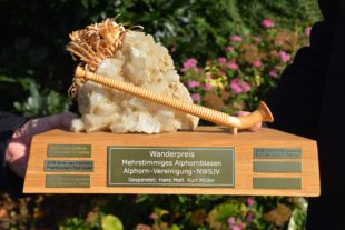 Foto: Hanspeter SchwendemannWanderpokal mit Miniaturalphorn, Bergkristall und holzgeschnitztem Edelweiß: Die Namensschilder dokumentieren die jeweiligen Jahressieger. Kann das »Echo vom Mühlstein« in den kommenden Jahren den Erfolg nochmals wiederholen, bleibt der Pokal endgültig in Nordrach. Einziger Nachteil wäre, dass die Sieger dann einen neuen Wanderpokal spenden müssen.