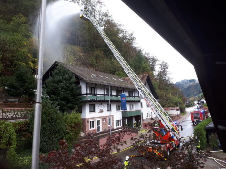 Die mittlerweile eingetroffene Drehleiter der Feuerwehr Zell am Harmersbach, die im Übrigen grundsätzlich nach der Alarm- und Ausrückeordnung bei Gebäudebränden sofort von der Leitstelle mitalarmiert wird, nahm direkt vor dem Gebäude Aufstellung. Zunächst zur Menschenrettung eingesetzt, leistete die Drehleiter später auch noch bei der Brandbekämpfung wertvolle Dienste. Wie immens wichtig auch ein Überblick von oben sein kann stellte man ebenfalls schnell fest. Die Besatzung im Korb der Leiter entdeckte zwei verletzte Personen im Bereich der Grillstelle, welche von der Straße aus nicht einsehbar war. Nachdem der Baum abgelöscht war und man somit Zutritt geschafft hatte, konnte sofort mit der Rettung dieser beiden Personen begonnen werden.