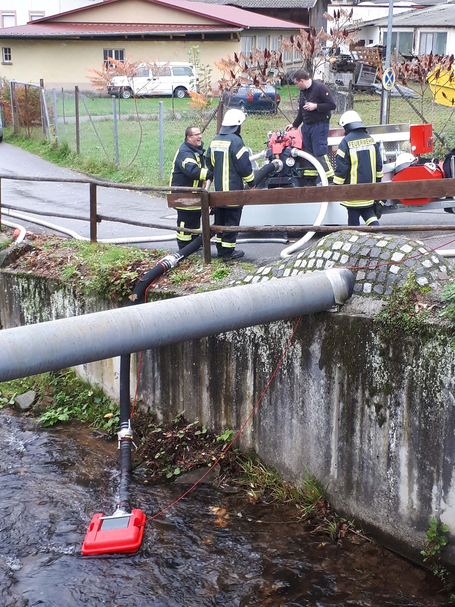 Aus diesem Grund entschied sich die Einsatzleitung vorsorglich, eine Wasserversorgung vom Talbach aufzubauen. Zur Brandbekämpfung leistete wiederum die Drehleiter sehr gute Dienste, man konnte den Hang über das Gebäude hinweg erreichen und somit gezielt und mit geringem Aufwand Löschwasser aufbringen.