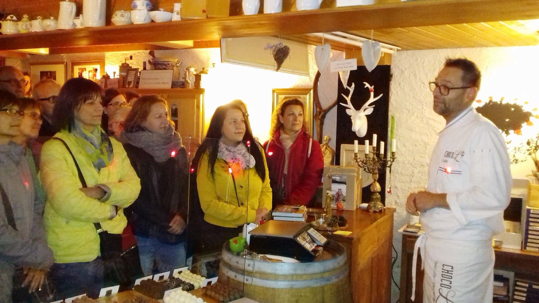 Der gemütliche Spaziergang führte über die Wiege der Moospfaff-Kugel. In der Chocolaterie ChocoL präsentierte Egbert Laifer gekonnt sein Herzensprojekt und nahm die Gäste mit auf eine Zeitreise durch das Leben des Moospfaffs und auch durch die Entwicklung der kleinen und feinen Schokoladenmanufaktur. Begeistert konnten die Besucher die Moospfaff-Pra­line selbst probieren und waren beeindruckt von der konsequent gelebten Regionalität bei der Verwendung der Zutaten.