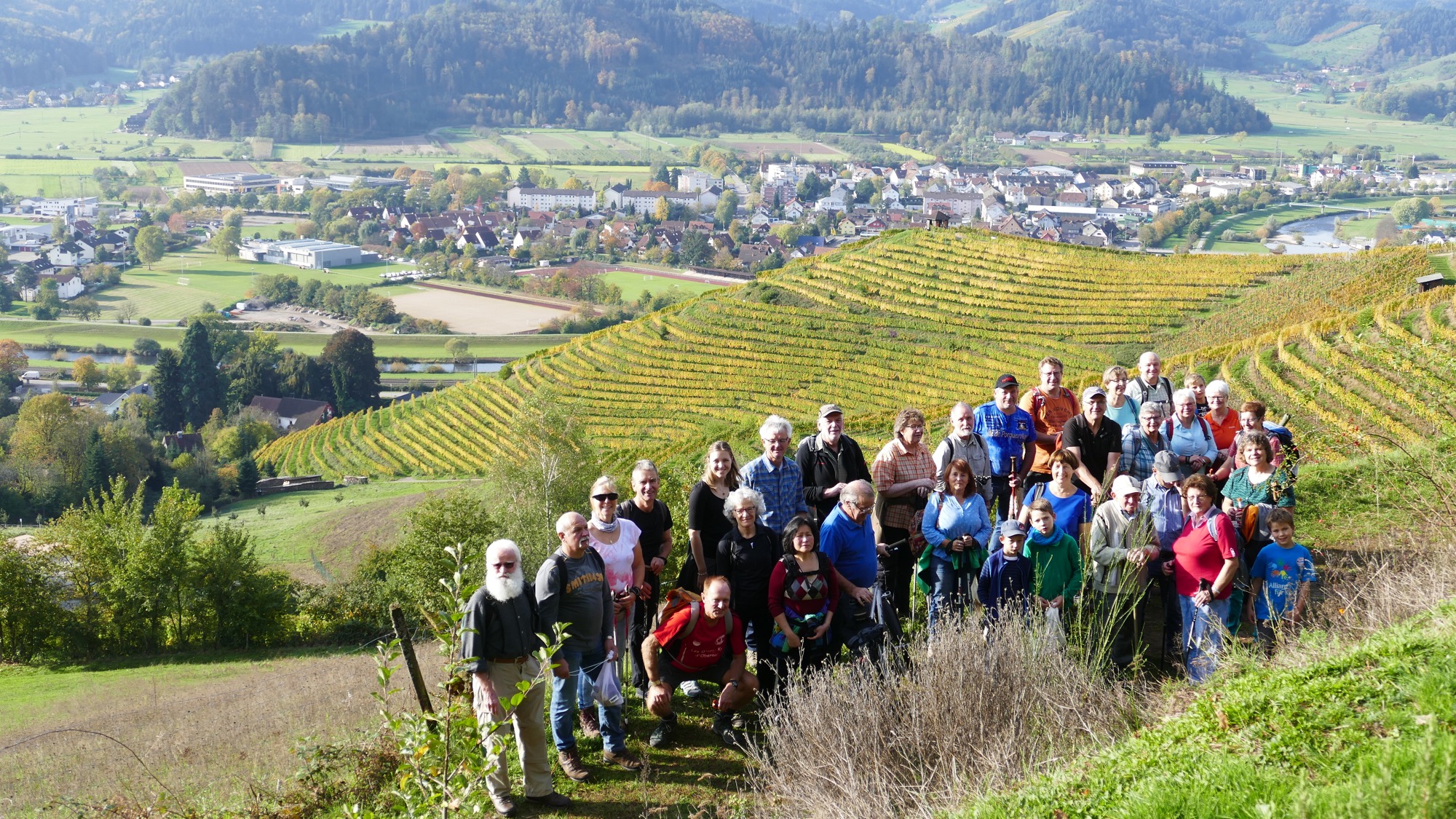 Die Tourenführung übernahm in diesem Jahr Albert Schätzle von den Berg- und Wanderfreunden. Er begrüßte die Anwesenden und gab einen kurzen Überblick über die Wanderroute. Dann ging es bei Sonnenschein ein Stück den Hüttersbach hinunter, um auf der anderen Seite über einen kleinen Pfad hinauf zur Portiunkula-Kapelle oberhalb des Abtsberges zu wandern. Von hier aus hatte die Gruppe einen schönen Rundblick über die Weinberge mit dem herbstlich bunten Laub hinunter ins Kinzigtal bis nach Offenburg und das Kinzigtal hinauf bis nach Biberach.