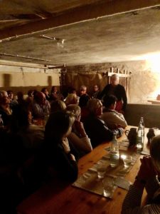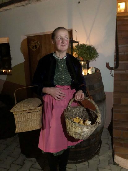 Fast 40 Interessierte hatten sich angemeldet, und so musste Angela Boschert kurz umplanen, um für alle ein schönes und gemütliches Plätzchen zu haben. Bei der Begrüßung in der Brennereierzählte Angela Boschert in ihrer Rolle als Pfifferlin-Zetzel alles Wissenswerte über die Likör-Herstellung auf ihrem Hof. Vom Ursprung des Brennens bis zur Auswahl der verschiedenen Früchte und Kräuter, alles kommt hier direkt vom Hof und wird in wohlschmeckende Brände und Liköre verarbeitet. Zur Begrüßung gab es gleich einen Moospfaff-Likör, diesmal heiß serviert und mit Sahne und Zimt, um sich zu wärmen und stilecht auf den Abend einzustimmen.