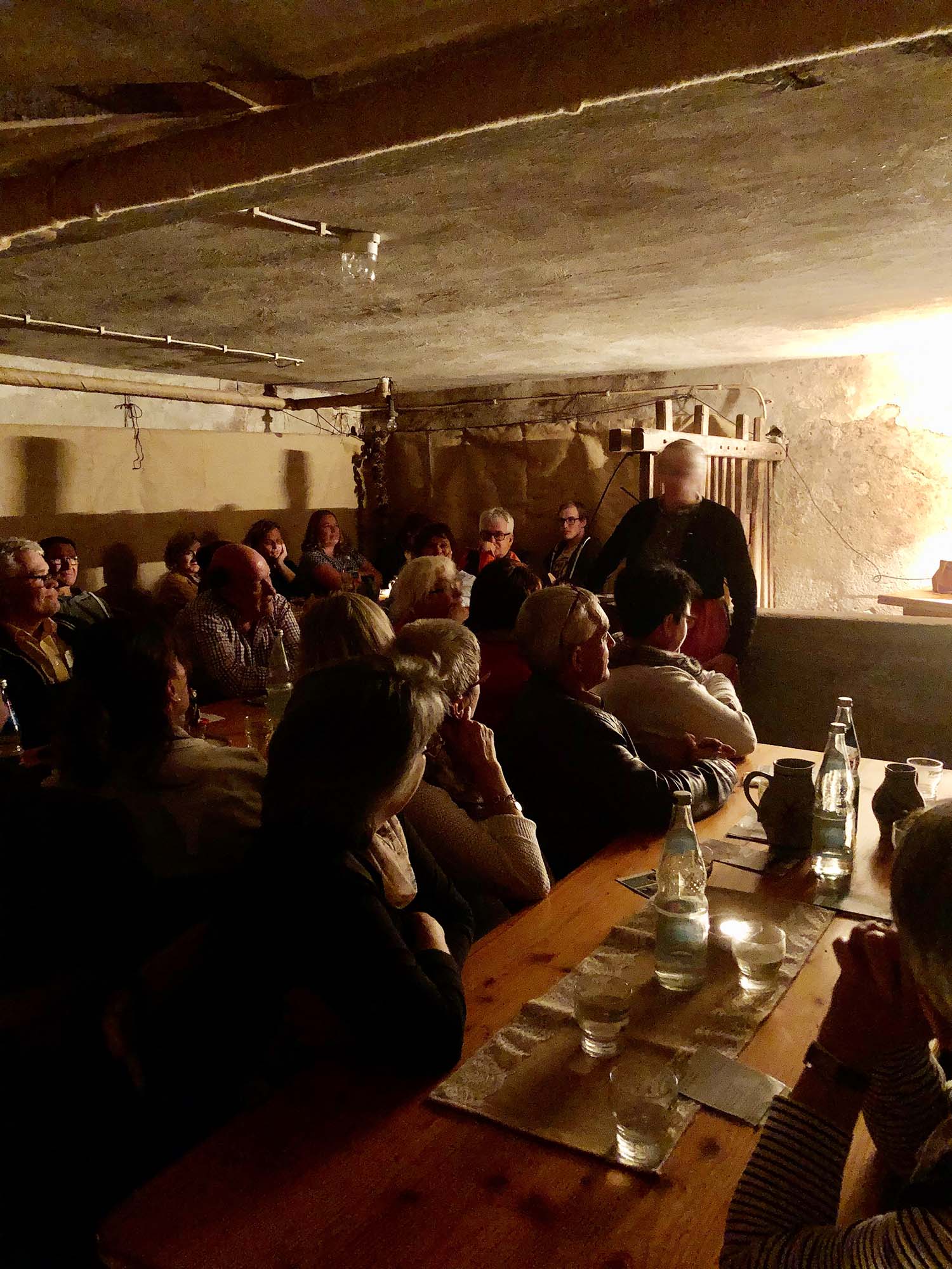 Dann wurden die Gäste in den urig beleuchteten ehemaligen Saustall des Hofes gebeten. Mit hofeigenem Vesper, liebevoll gerichtet und serviert, wurden die Besucher verwöhnt: es gab verschiedene Wurstspezialitäten, Speck, Schmalz, Bibbeliskäs und selbstgebackenes Brot bis alle statt waren.