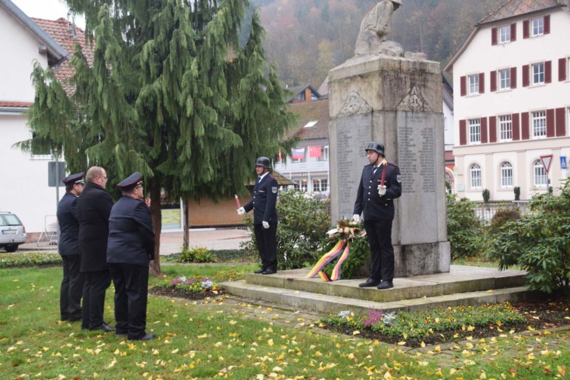 Bürgermeister Carsten Erhardt, Feuerwehrkommandant Heiko Spinner und sein Stellvertreter Clemens Isenmann legten anschließend zum Gedenken an die Toten am Ehrenmal einen Kranz nieder. Die Trachtenkapelle spielte dazu das Lied »Ich hatt‘ einen Kameraden«.