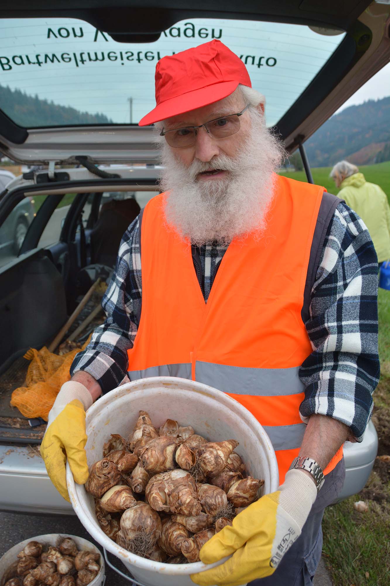 Paul Boschert hat die Pflanzaktion organisiert und dabei eine elfköpfige Helfergruppe um sich geschart. Ausgestattet mit Warnwesten und Hacken wurden die Blumenzwiebeln in den vergangenen Tagen nun gesetzt. Zuvor hatte Paul Boschert mit