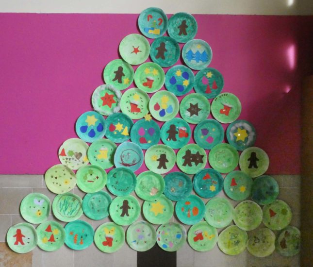 Aus Papptellern und Farbe entstand kreativer Wandschmuck in Tannenbaumform.