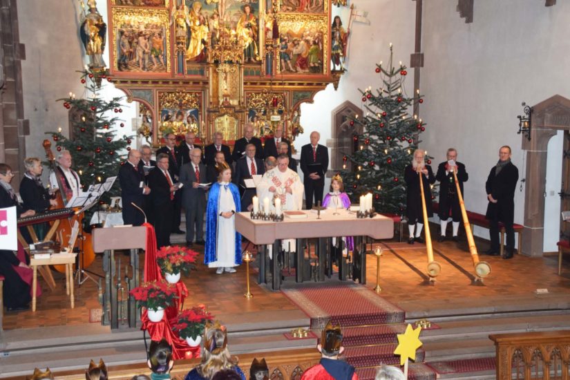 Die Pfarrkirche war wie an hohen kirchlichen Festtagen besetzt, als Pfarrer Bonaventura Gerner am Sonntagmorgen mit Lektor und Ministranten in die Pfarrkirche einzog. Die Eucharistiefeier mit den Sternsingern wurde mit dem Dankgottesdienst zum 60-jährigen Bestehen der Alpenvereins-Ortsgruppe zusammengelegt. So bot sich den Kirchenbesuchern ein beeindruckendes Bild und ein großartiges Klangerlebnis, wenn Stubenmusik, Alphornbläser und Wandererchor Windschläg im Chorraum musizierten und die Ministranten in ihren königlichen Gewändern am Altar ihren Dienst versahen.