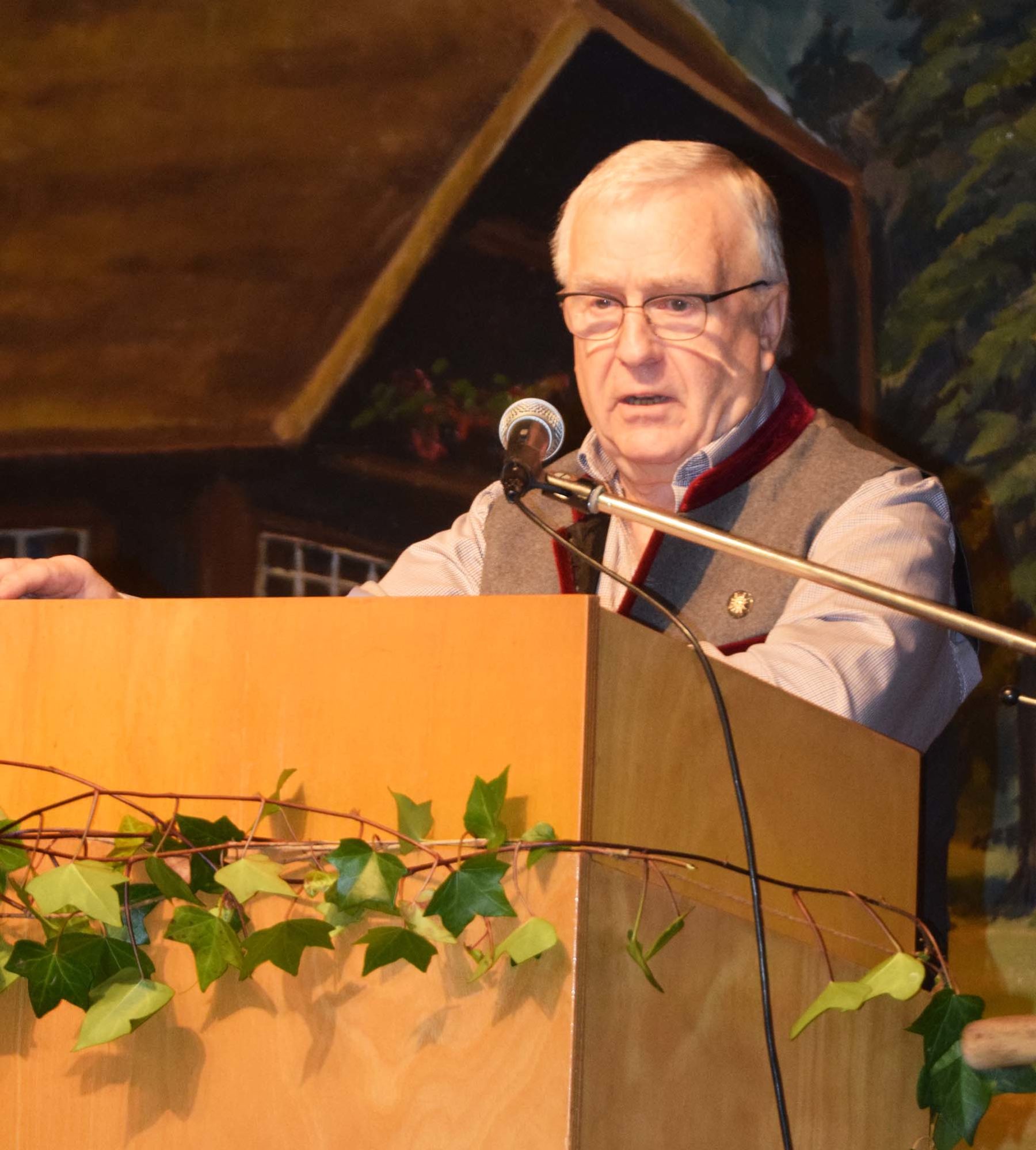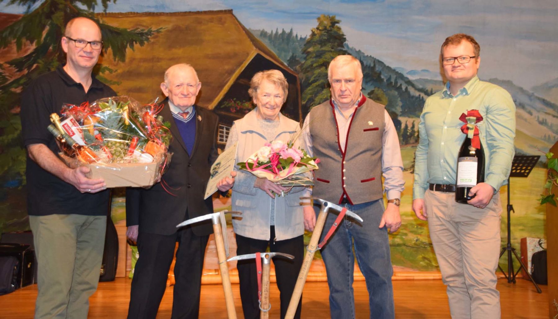 Im Rahmen des Banketts dankte Bieser auch speziell den Gründungsmitgliedern Karl Bendler und Bernhard Welle. Karl Bendler konnte wegen einer anderweitigen Verpflichtung nicht anwesend sein, seine Ehrung wird nachgeholt. Reinhold Bieser würdigte die Verdienste von Bernhard Welle, der an vielen Bergtouren, auch als Tourenführer, teilgenommen habe und Helfer bei unzähligen Arbeitseinsätzen gewesen sei. »Braucht man einen Helfer, einfach Bernhard Welle fragen, er ist immer zur Stelle«, lobte ihn Bieser. Zum Dank erhielt er eine Ehrenurkunde und Geschenke, seine Ehefrau Doris einen Blumenstrauß und beide einen großen Applaus des Publikums. Weiterhin dankte er den vielen Helfern und Akteuren des Vereins sowie seiner Ehefrau Luitgard, die ihn immer nach Kräften unterstütze.