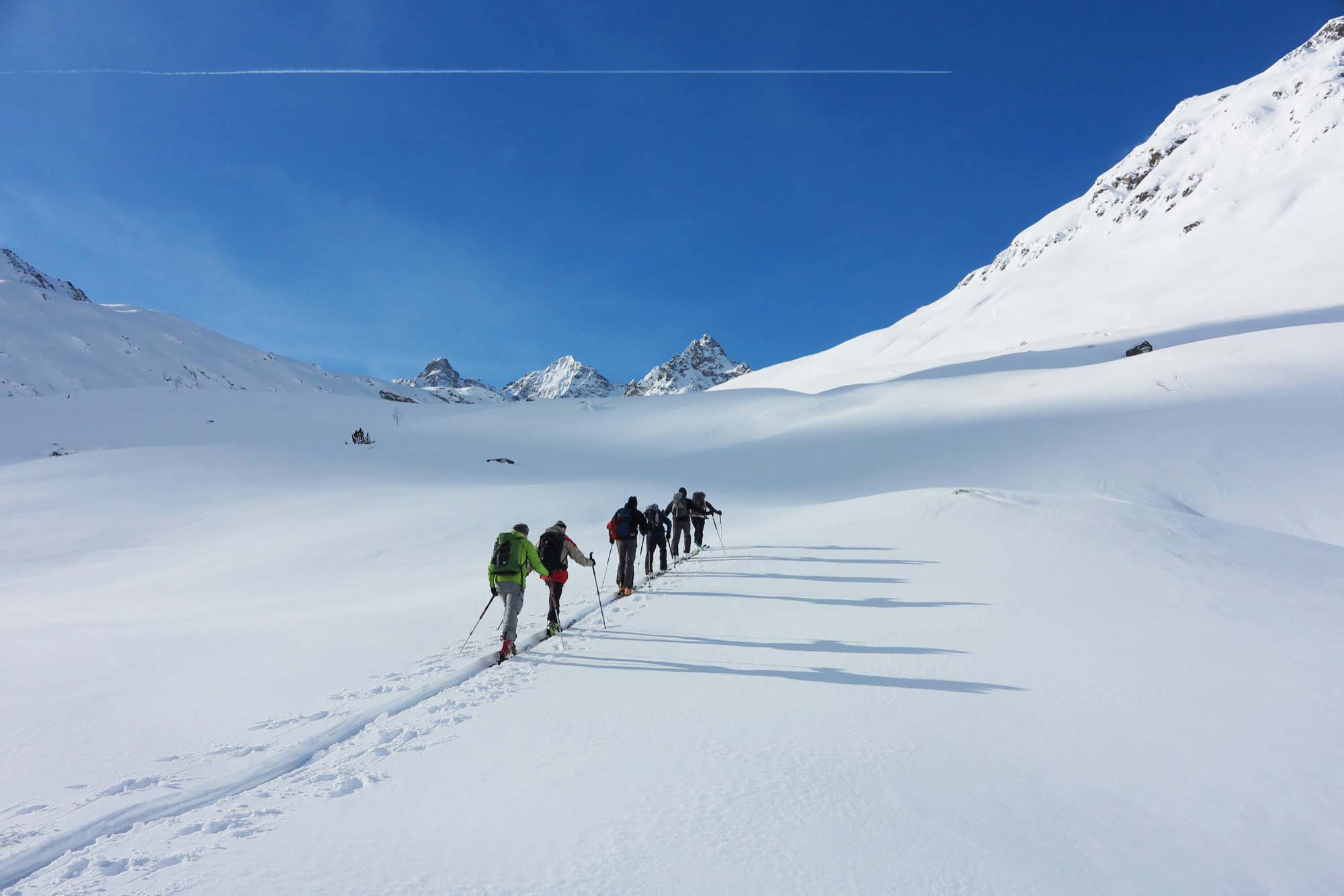 Mit 30 Teilnehmern reiste der Alpenverein-Ortsgruppe Nordrach im »Jubiläumsjahr« ins Montafon hinauf auf die Bielerhöhe. Mit zwei sonnigen Tagen startete die »Weiße Woche«, was die Skitourengeher gleich mit der Besteigung von Hennekopf (2.704 m) und Sonntagsspitze (2.882 m) nutzten. Trotz leichter Wetterstörung folgten Touren ins Bieltal und zur Rauhkopfscharte. Der Höhepunkt war sicherlich bei Sonnenschein die Skitour ins Kromertal hinauf zur Kromer Scharte (2.800 m). Die Talfahrt mit 1050 Höhenmeter auf unberührten Hängen und in feinstem Pulverschnee hinunter zum Vermunt Stausee (1.743 m) war ein Genuss.