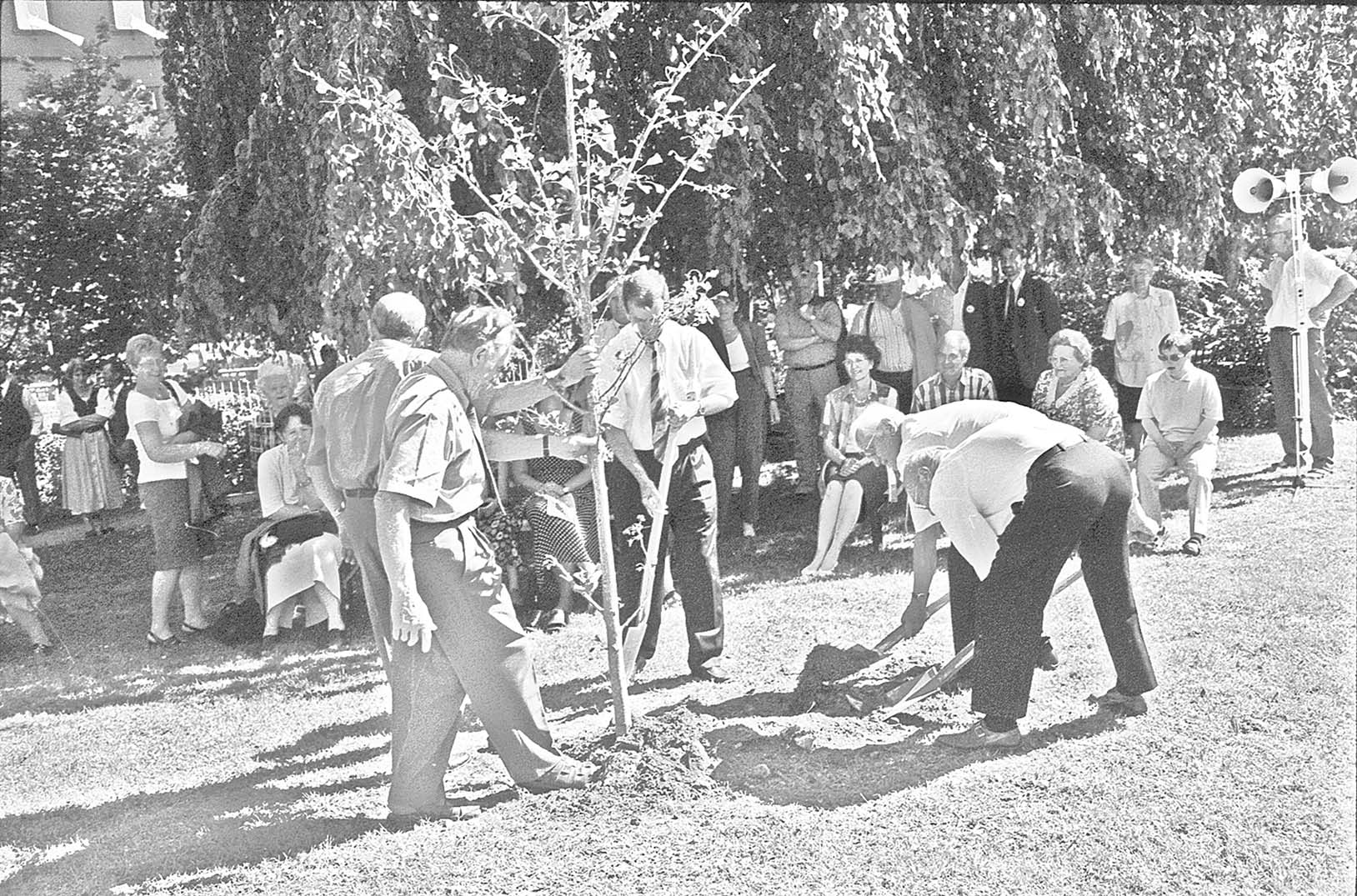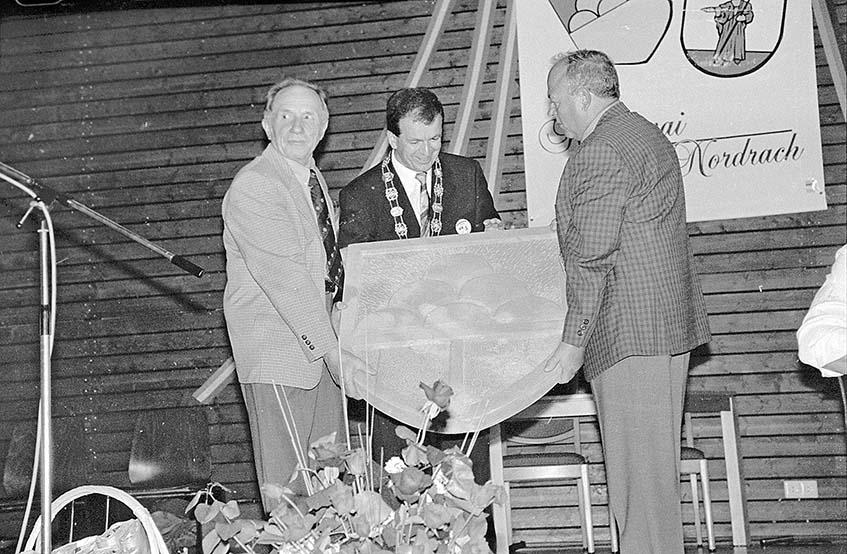 An beiden Ortseingängen, Dorf und Kolonie, wurde jeweils eine Partnerschaftstafel enthüllt. Ein weiterer Höhepunkt war der »traditionelle Nordracher Hochzeitszug«, der mit zahlreichen Trachtenträgerinnen und -trägern von der Maile-Gießler-Mühle zum Festplatz zog. An seinem Weg standen die Besucher dicht gedrängt und sparten nicht mit Beifall. Ehrenbürger Kurt Spitzmüller spendete einen Gingko-Baum, bekannt als »Freundschaftsbaum«, und pflanzte ihn zusammen mit den beiden Bürgermeistern in die Anlage zwischen den beiden Kriegerdenkmälern.