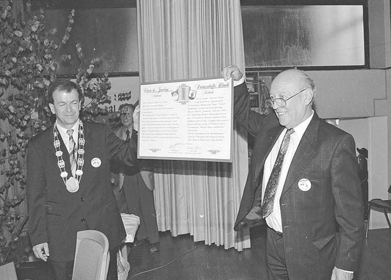 Der offizielle Festakt fand anschließend in der Hansjakob-Halle statt, die bis auf den letzten Platz besetzt war. Nach den Ansprachen der beiden Bürgermeister unterschrieben diese in einer feierlichen Zeremonie die Partnerschaftsurkunde. Landrat Günter Fehringer und Staatssekretär a. D. Robert Ruder hoben in ihren Grußworten hervor, wie wichtig solche Partnerschaften nach der jahrhundertelangen Feindschaft zwischen den beiden Völkern seien und gratulierten den beiden Gemeinden. Die Trachtenkapelle Nordrach spielte das »Badner Lied« und der Männerchor Nordrach sorgte mit einem »europäischen Wahnsinnschor« für beste Unterhaltung. Die Schulkinder aus Niedernai hatten sich gut vorbereitet und trugen Lieder in deutscher und französischer Sprache vor.