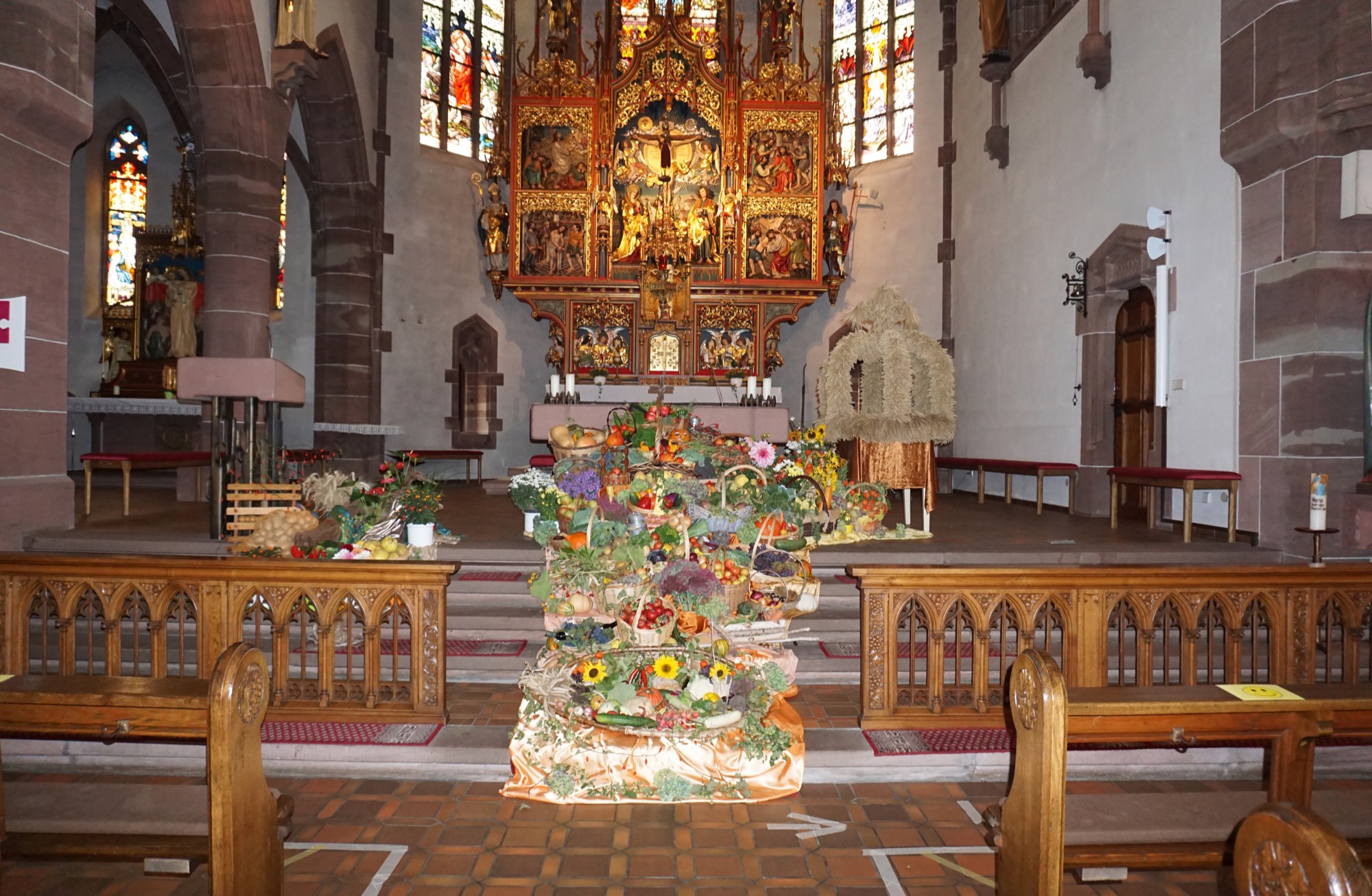Die für das Erntedankfest wunderschön geschmückte Pfarrkirche war für den Einführungsgottesdienst der perfekte, feierliche Rahmen. Das Blumenteam hatte mit den Gaben der Trachtengruppe sowie der Gemeindemitglieder wieder liebevoll einen reichen und bunten Erntedankaltar gestaltet, so dass der Altarraum für die Gottesdienstbesucher ein tolles Bild abgab.