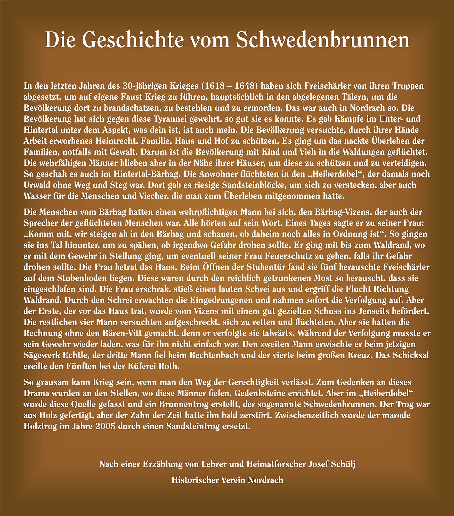 »Schwedische Freischärler zogen im Dreißigjährigen Krieg durch das Nordrachtal, um zu brandschatzen, zu stehlen und zu morden. Die Bevölkerung ist mit ihrem Vieh in die Wälder geflüchtet, so auch im Gewann Bärhag. Die Bewohner versteckten sich im Heiberdobel, einem unzugänglichen Gebiet. Der Bären-Vitt und seine Frau wollten nachschauen, ob in ihrem Haus alles in Ordnung sei. Sie entdeckten fünf betrunkene Schweden in ihrer Wohnstube. Diese versuchten zwar zu fliehen, wurden aber vom Bären-Vitt verfolgt und einer nach dem anderen erschossen.«