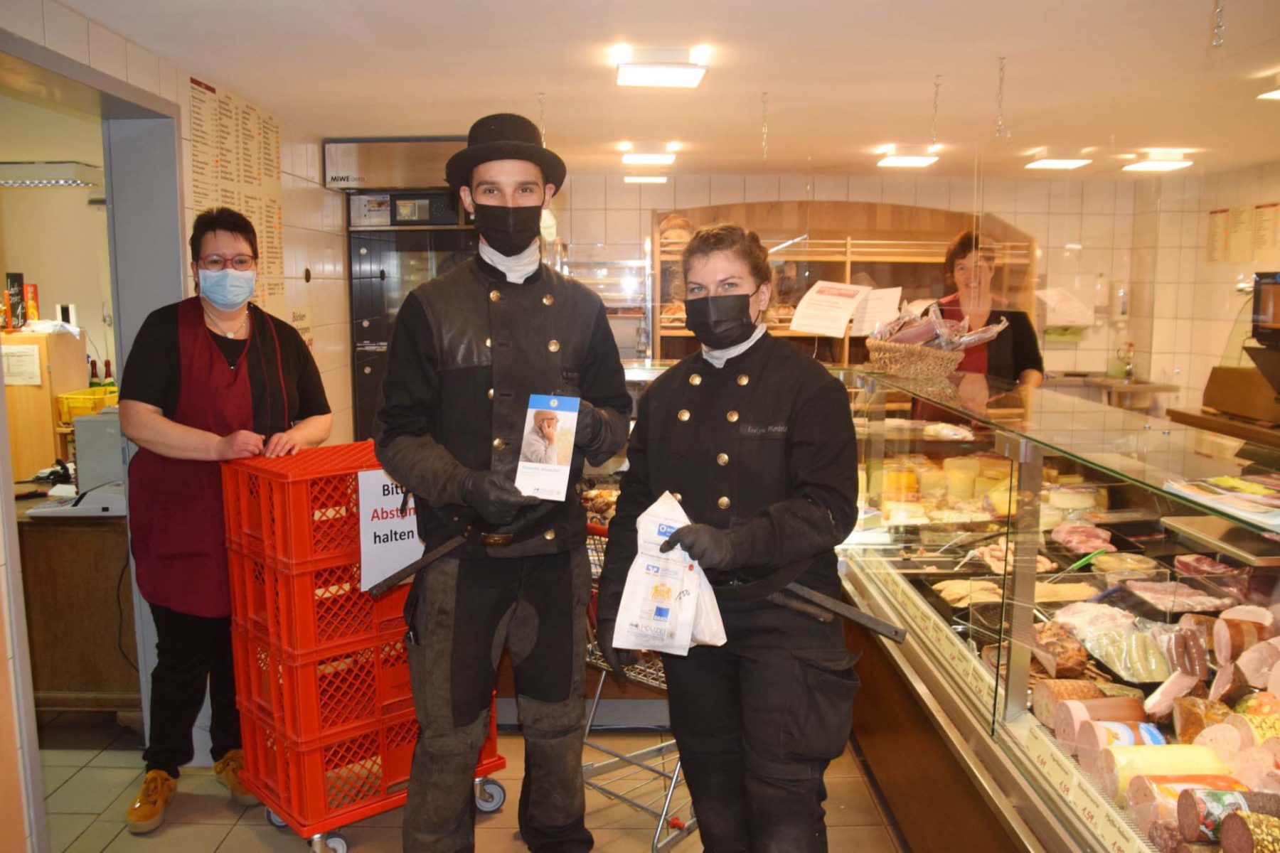 Die Kunden des Frischemarkt Herbrik in Nordrach erhalten in den nächsten Wochen die Backwaren in den bedruckten Bäckertüten. Links Geschäftsinhaberin Christine Herbrik, daneben zwei besondere Kunden.