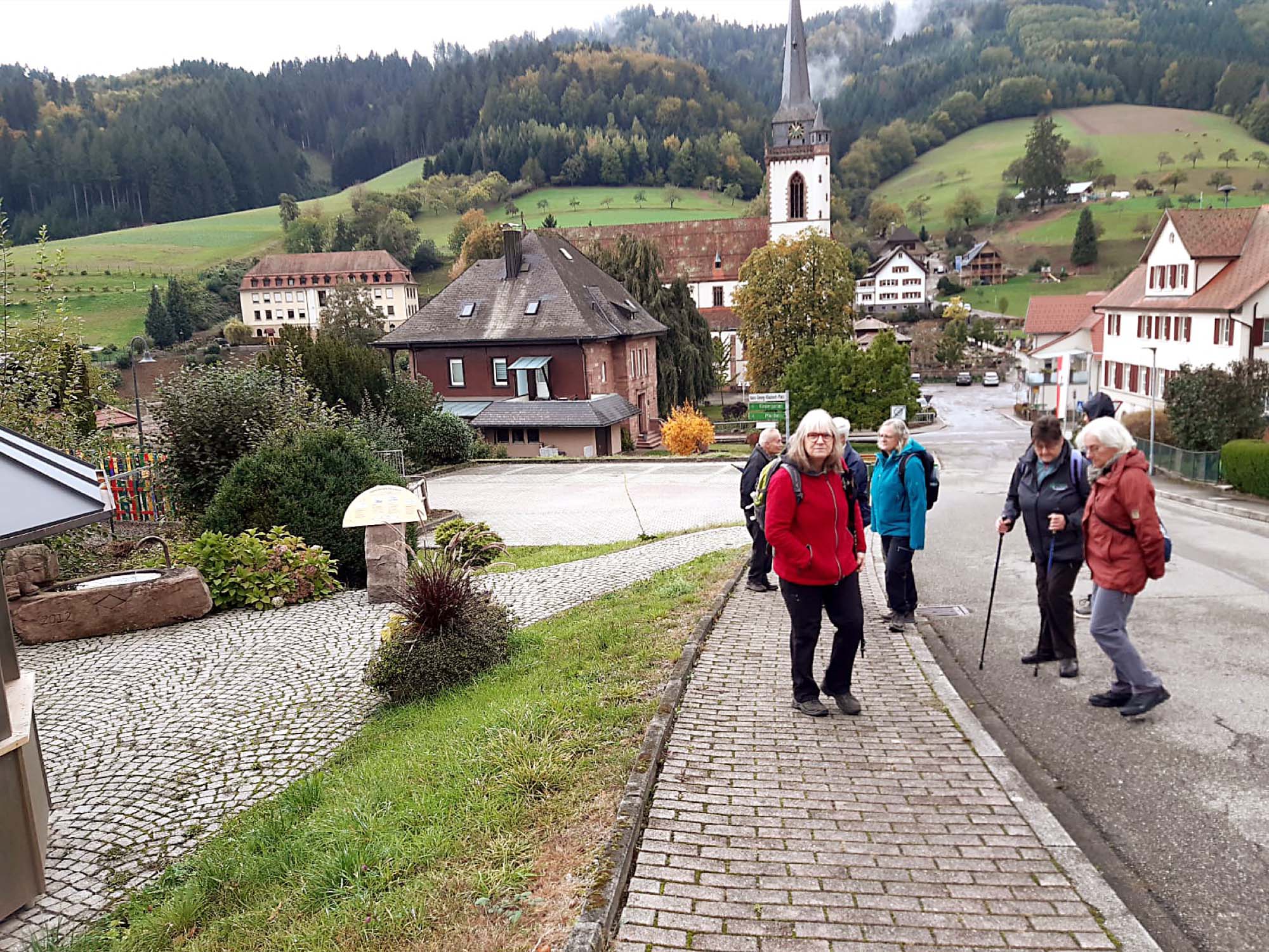 Der nächste kurze Halt war bereits beim Hans-Georg Kluckert-Platz. Gewandert wurde über den Schanzbach Richtung Grafenberg und Hutmacherdobel. Viele Kastanienbäume mit ganz unterschiedlich großen und kleinen Früchten waren unterwegs zu finden. Ausblicke aufs Nordrachtal wurden zwischendurch genossen. Im Hutmacherdobel wartete der steilste Anstieg, der rastlos und bei strahlendem Sonnenschein erklommen wurde. Oben angekommen gab es eine kleine Esskastanienverkostung. Es gab dreierlei: Gekocht, gebacken und gebraten waren die Versucherle. Nach Absprache mit den Wanderteilnehmern ging es auf fast ebenem Weg Richtung Flacken. Auch auf diesem Weg waren immer wieder große und kleine Kastanienbäume zu sehen. Über einen Wiesenweg wurde das kulinarische Etappenziel erreicht. In der warmen Stube mit dem jeweiligen »Corona-Abstand« gab es eine feine Kastaniensuppe, Kastanien-Quittenkompott, einen Kastanienkuchen mit Vanillesahne nach altem Badischen Rezept und eine köstliche Kastanienpra­line. Frisch gestärkt lief man übers Wieberwegle und im Zickzack zurück zum Ausgangspunkt im Dorf, immer wieder unterbrochen von Kastaniensammelaktionen.