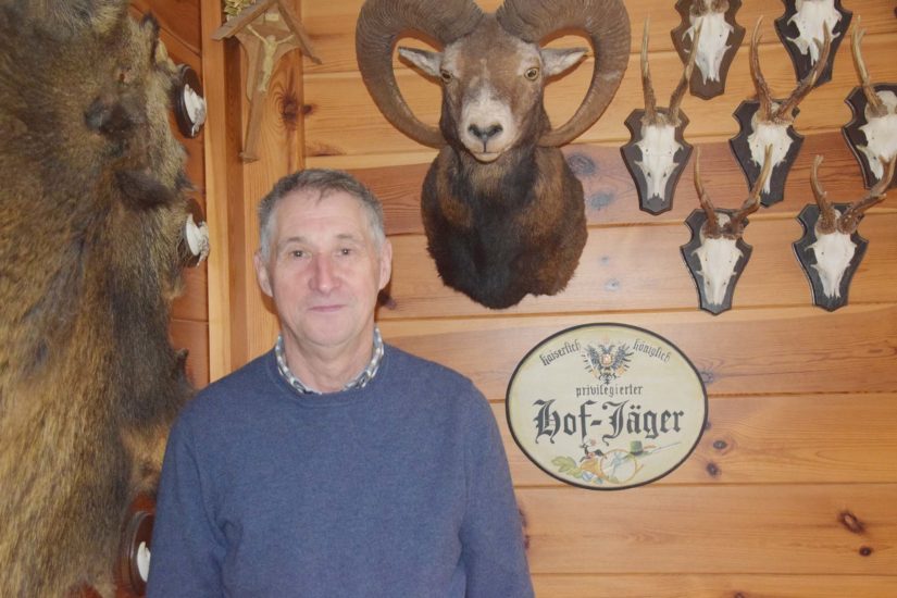 Günther Schnurr vor seiner Trophäenwand, darunter ein Muffel aus der Eifel. Foto: Herbert Vollmer