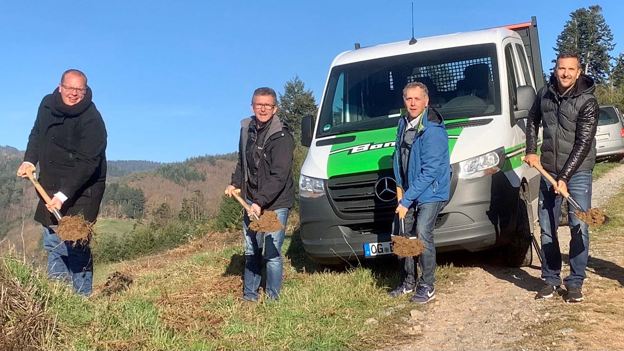 Mit dem 1. Spatenstich wurde offiziell mit der Erschließung von zwölf weiteren Grundstücken im Baugebiet Grafenberg begonnen. Im Einsatz waren (von links): Bürgermeister Carsten Erhardt, Planer Dietmar Ribar vom Büro Zink), Norbert Isele vom Erschließungsträger KE sowie Bauunternehmer Martin Bonath. Foto: Gemeinde