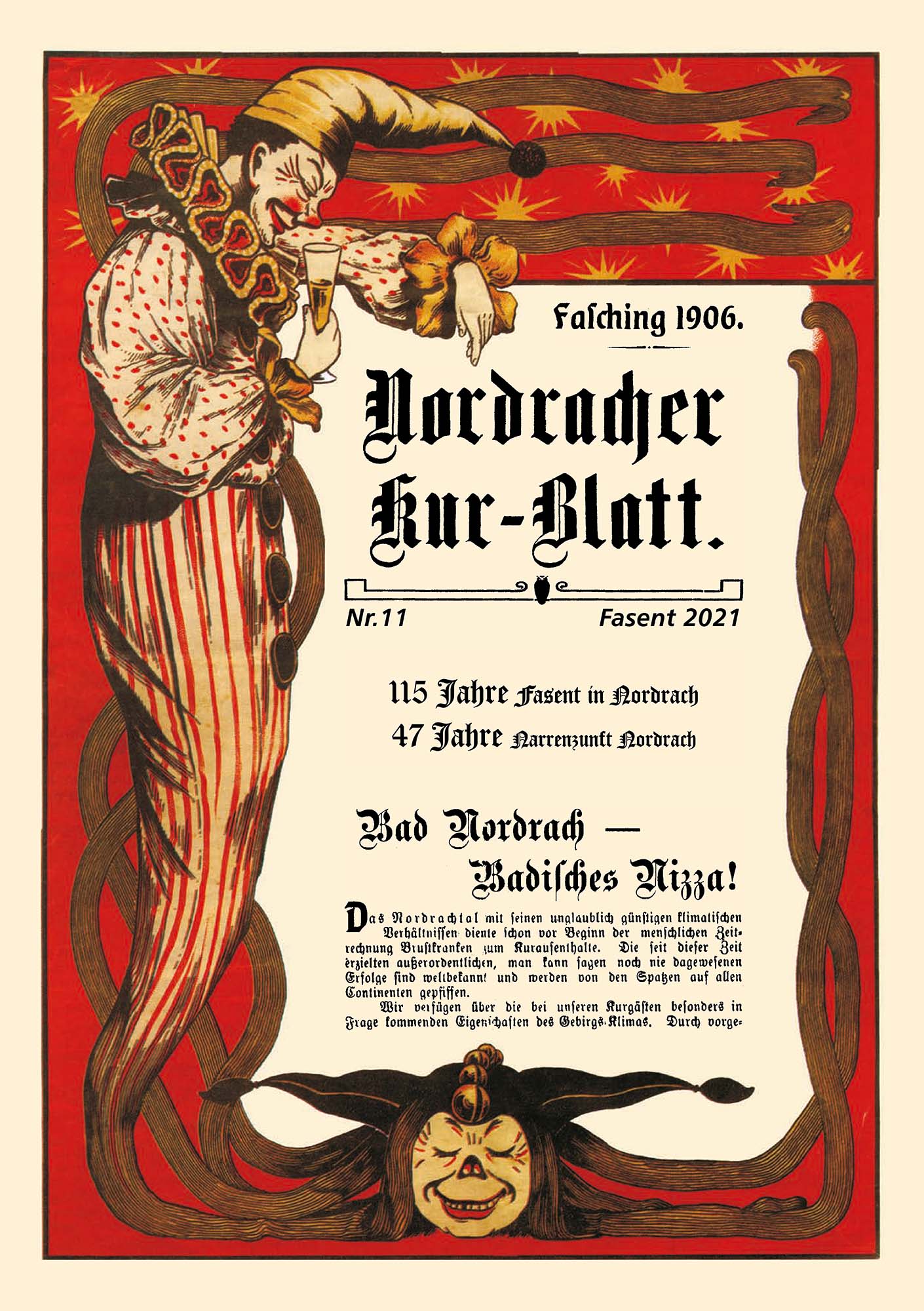 In diesem Jahr gibt es wieder die Nordracher Fasentzeitung, welche traditionell alle fünf Jahre erscheint. Es ist schon die 11. Ausgabe des Nordracher Kur-Blattes, das zur Fasent 1906 erstmals erschienen ist. Das Team der närrischen Redakteure hat sich wieder einiges einfallen lassen, um euch in diesem Jahr ein Stück Fasent für Daheim zu liefern. Wir bedanken uns bei allen Einzelpersonen, Vereinen und Geschäften, die sich an der Fasentzeitung beteiligt haben.