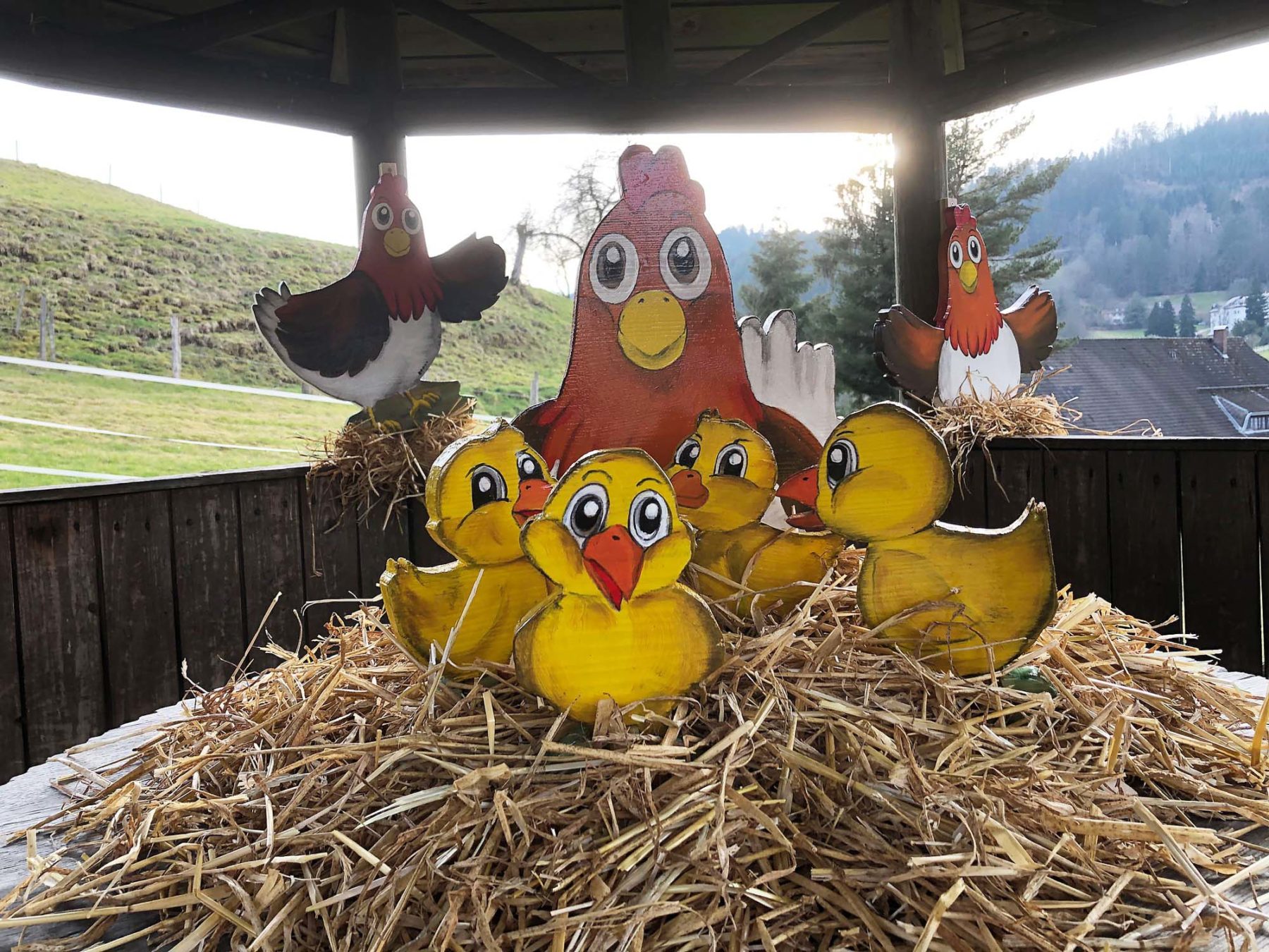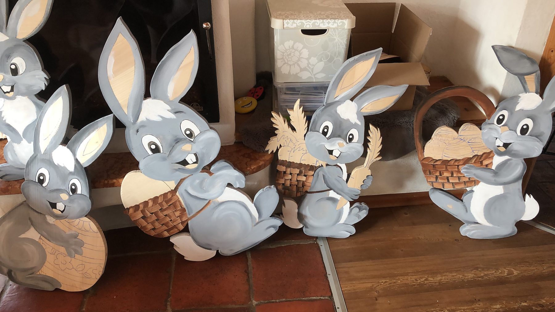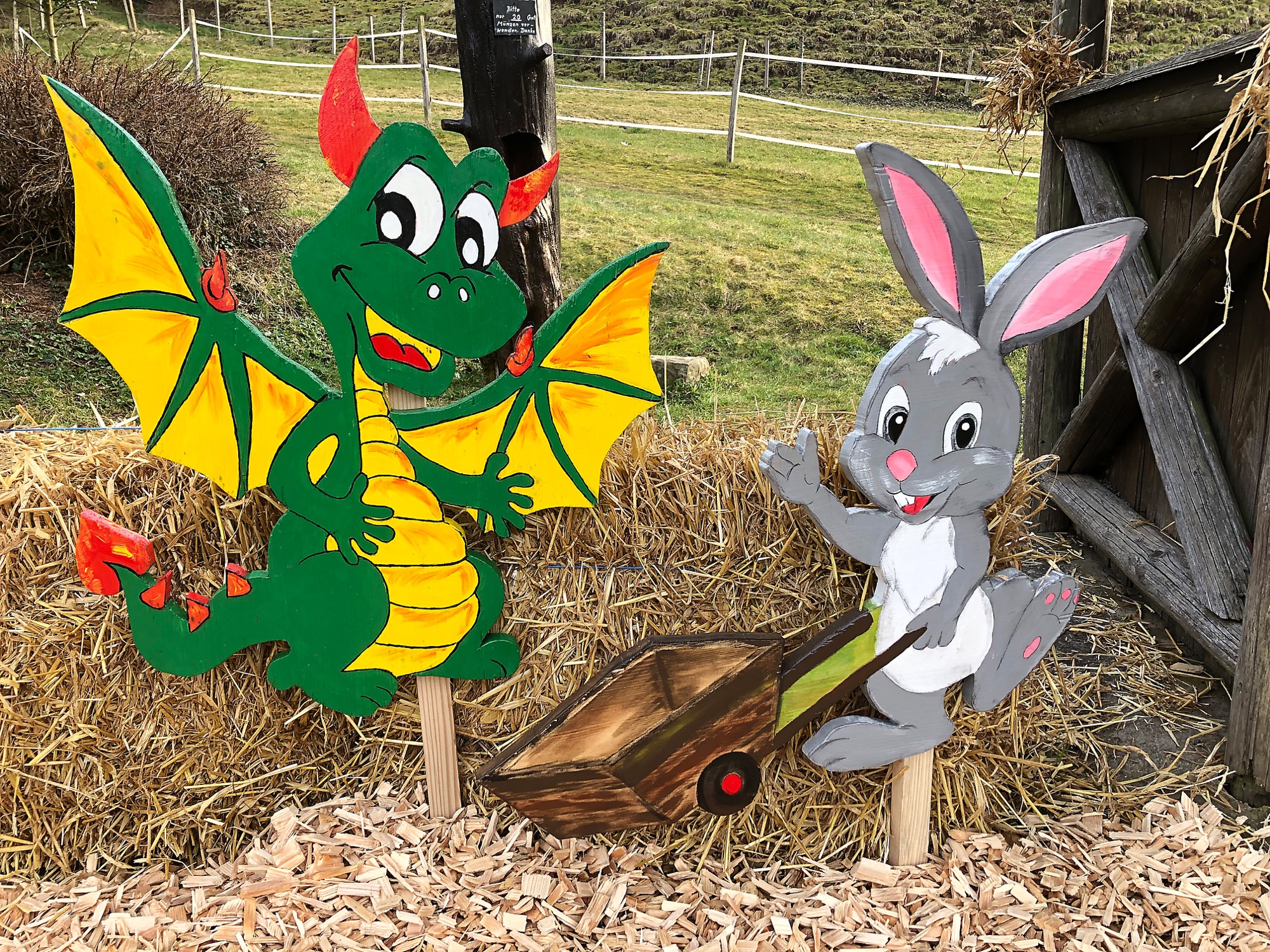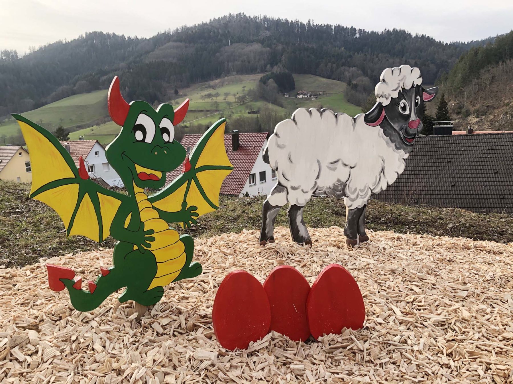 Unter der Federführung von Michaela Neuberger wurden 14 lebendige Rätsel- und Erlebnisstationen gestaltet: unzählige Eier und Körbchen, 6 Hühner, 4 Küken, 16 Osterhasen, 2 große Schafe und 3 Lämmchen, 2 neue Igel, 2 Eulen, 3 Spechte und 6 neue NORDIs wurden ausgesägt und liebevoll bemalt.