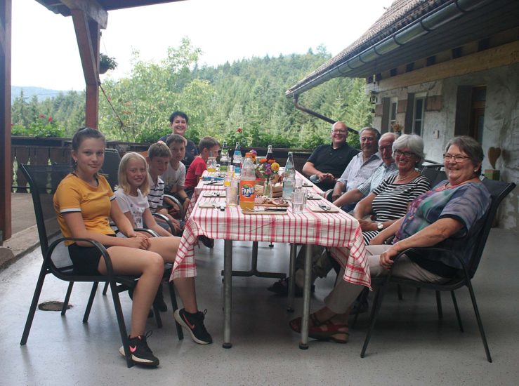 Zu Ehren der Jubiläumsgäste: ein leckeres Vesper in idyllischer Umgebung und großem Familienkreis (von links): Hanna Bohnert, Franziska Schmitz, Philipp Schmitz, Simon Bohnert, Manuel Bohnert, Carola Bohnert, Bürgermeister Carsten Erhardt, Paul Bohnert, Heinz Schmitz, Erika Schmitz, Ursula Bohnert. Foto: Touristen-Information