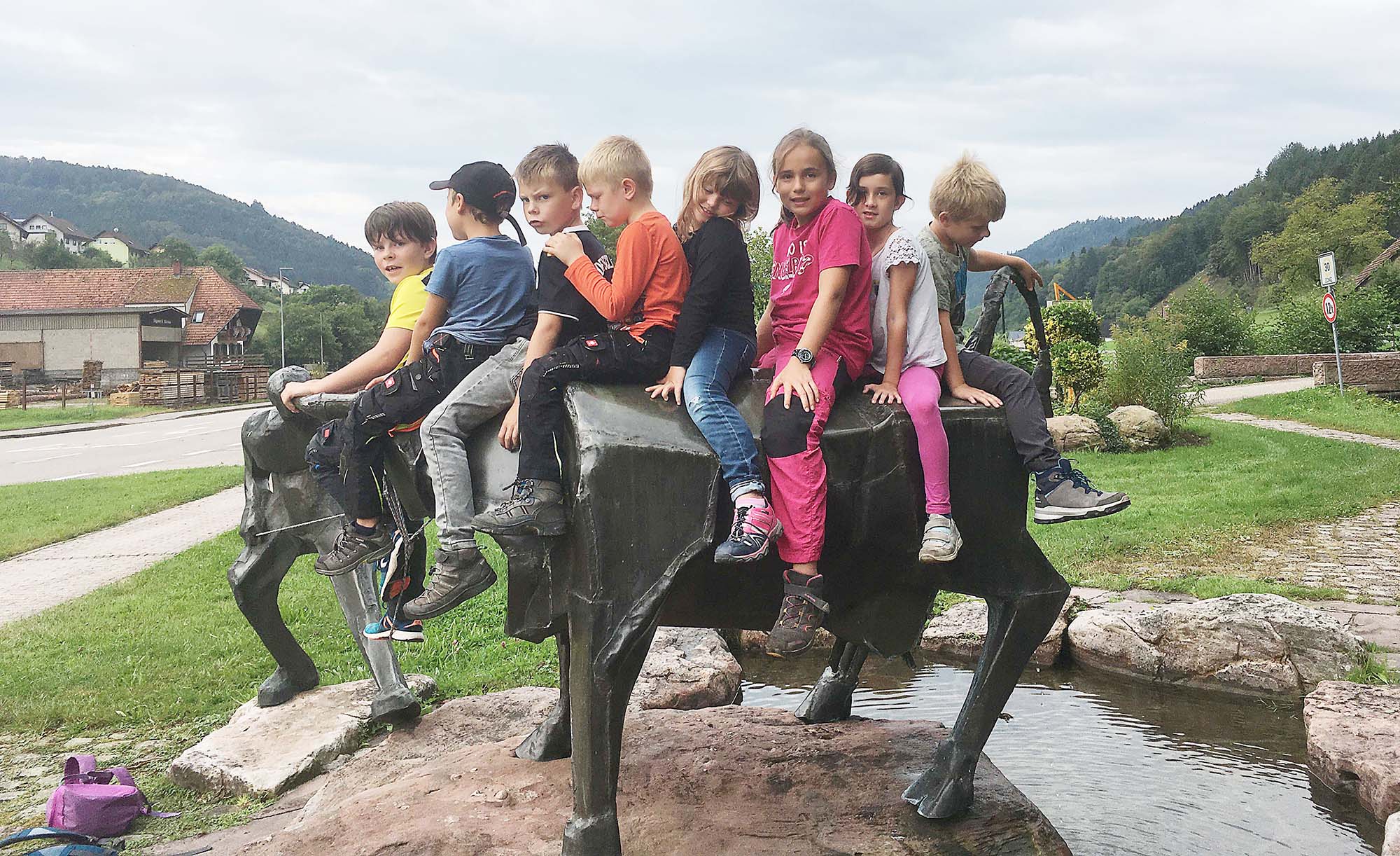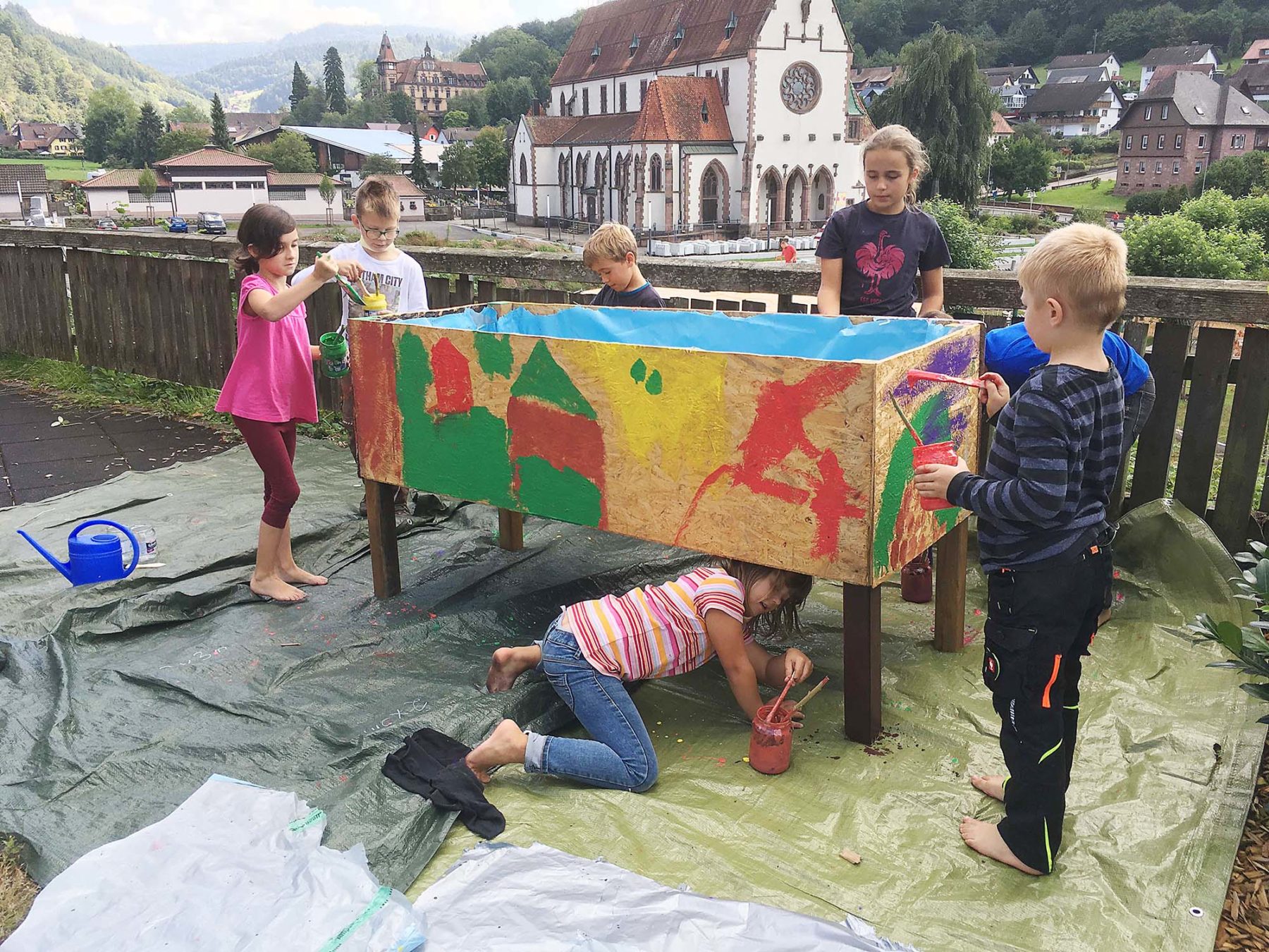 Zielsicher schwangen die Kinder den Minigolfschläger im Oberharmersbacher Adventure-Park – alle wurden Sieger! Ein wunderschönes Erlebnis war zudem das Baden in der Nordrach. Die Kinder bauten einen kleinen Staudamm, so dass sie sich mit einer Schwimmhilfe auf dem Wasser treiben lassen konnten.