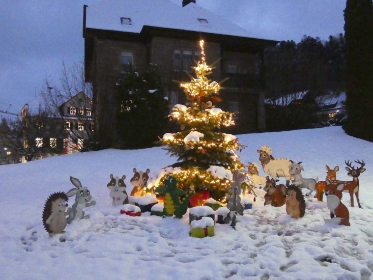 Davor, auf dem Weg und an den Rätselstationen, begegnet man den Hamstern, den Hasen, den Rehen, der Eule, den Igeln, den Ziegen und den Schafen. Die von Hand ausgesägten und mit Liebe gestalteten Tiere möchten in diesem Jahr ein ganz besonderes Weihnachten mit dem kleinen, grünen NorDrachen feiern. Jeder bringt etwas mit, jedes Tier hat seine eigenen Wünsche. An der letzten Station versammeln sich NorDi und seine Freunde beim gemeinsam geschmückten und festlich beleuchteten Weihnachtsbaum.