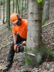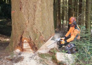 Fallkerb und Fällkeile gehören noch heute zur Technik des Baumfällens, obgleich längst die Motorsäge zum Einsatz kommt. Doch auch die hat ihre Tücken. »Ich denke, dass die Unfallhäufigkeit früher mit Sicherheit höher war, weil man pro Festmeter Holzeinschlag viel mehr Mannstunden hatte«, berichtet der aus der Schwäbischen Alb stammende Wahl-Nordracher von Schnittverletzungen, Stürzen, Sägeverletzungen, Verletzungen durch Axthiebe und einigem mehr. Durch die Einführung der Motorsäge, wohl ab der 1950er Jahre, aber habe zunächst die Schwere der Verletzungen teilweise zugenommen.