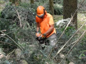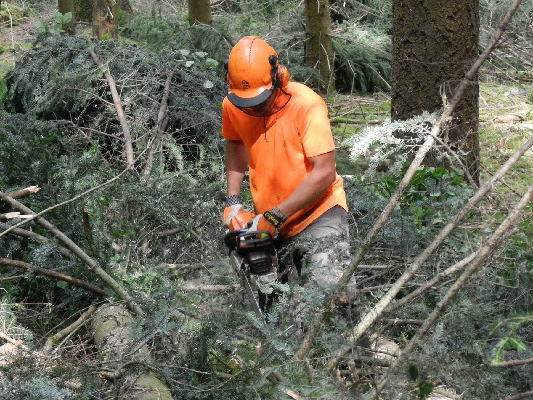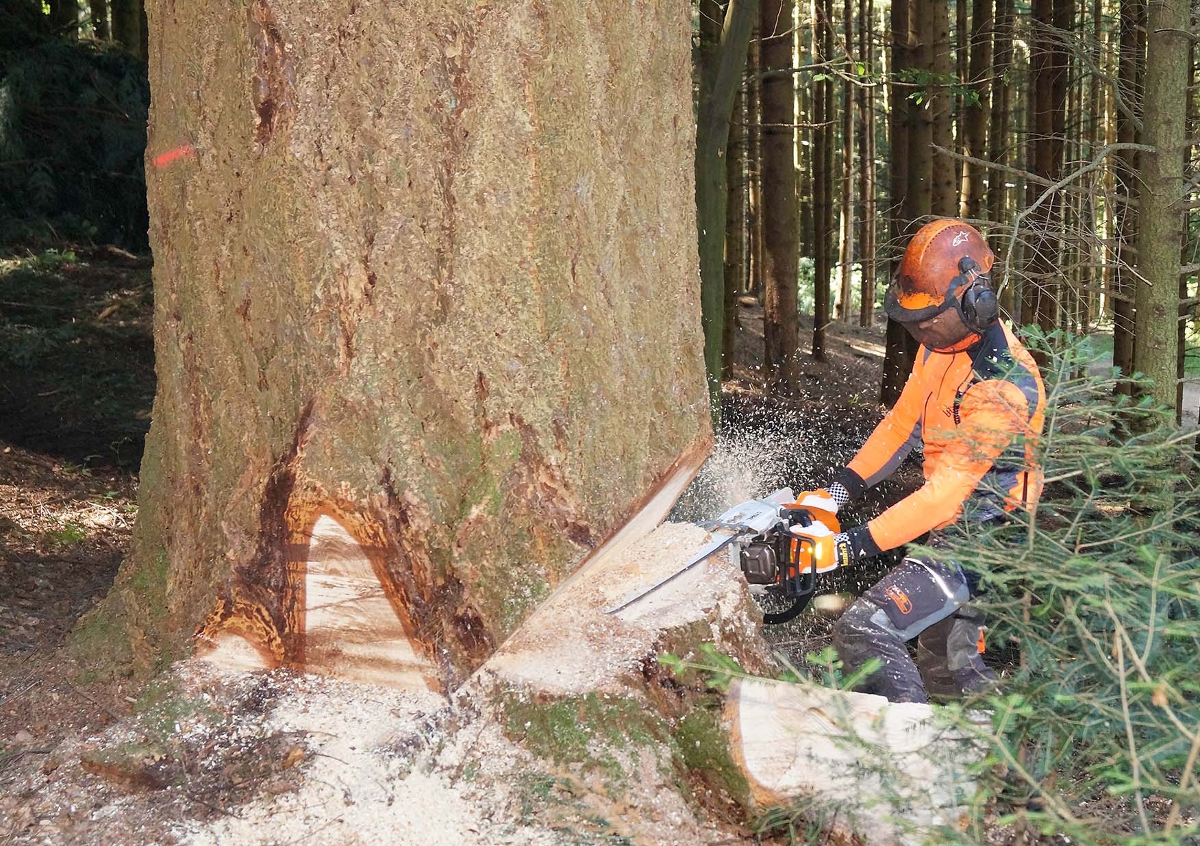 »Ich selbst habe Bäume noch lange mit der Axt entastet. In meiner Ausbildung wurde die Motorsäge nur zum Fällen und Entasten von mittelstarkem und Starkholz verwendet, aber Schwachholz haben wir von Hand entastet.« War man gut genug, ging das so schnell wie mit der Motorsäge, »in zehn Minuten hat man die Äste weggehabt.«