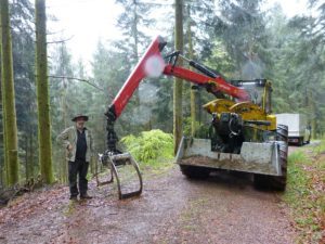 Heutzutage jedoch wird fast das ganze Jahr über Holz geerntet, werden Bestände gepflegt. Bis auf eine wachstumsbedingte Pause im Sommer sowie witterungsbedingte Unterbrechungen. Schließlich gilt es, fest angestelltes Waldpersonal ebenso auszulasten wie moderne Maschinen – Rückeschlepper beispielsweise. Ein solcher holt heutzutage die entasteten Stämme aus dem Nordracher Wald.